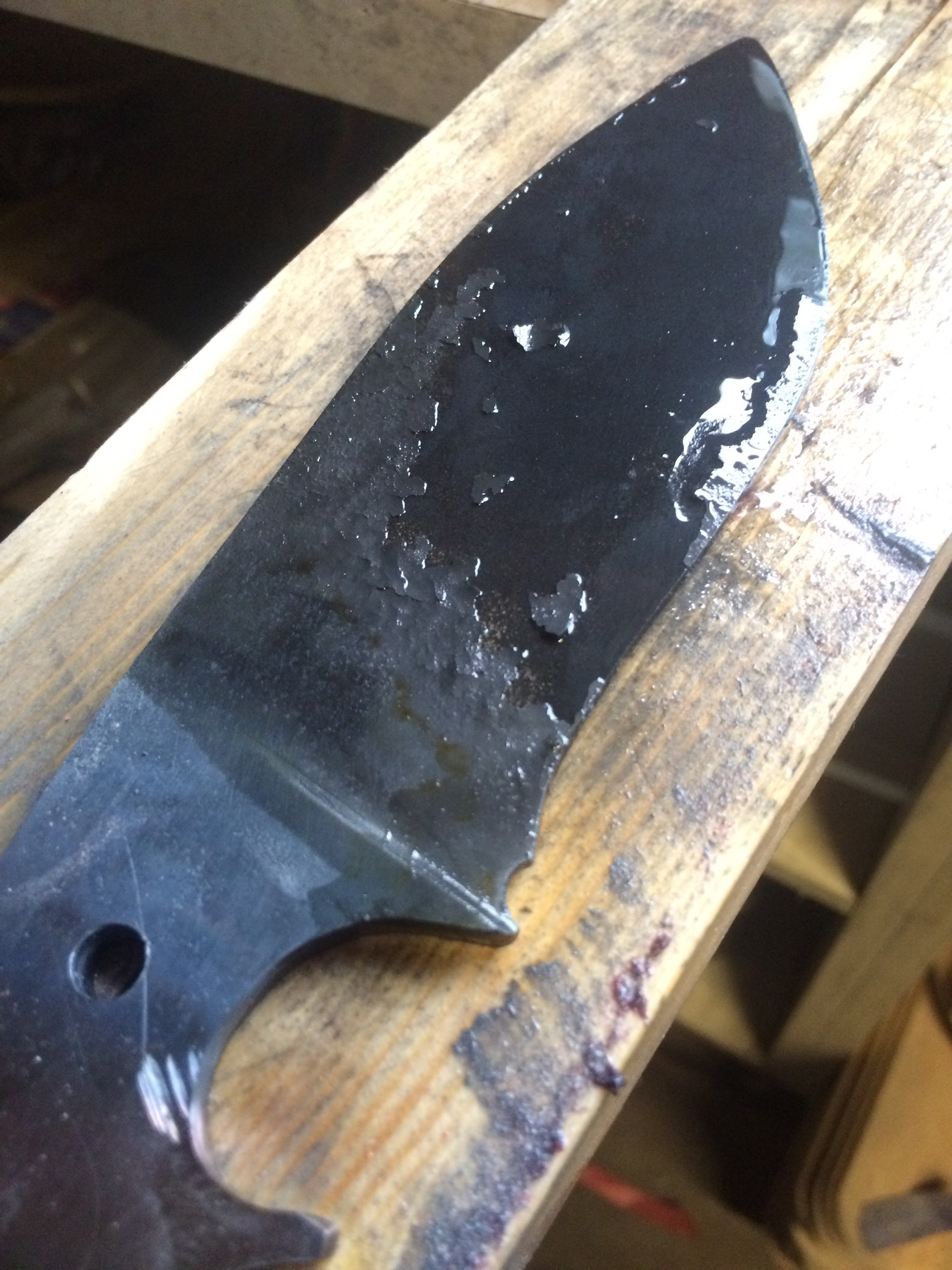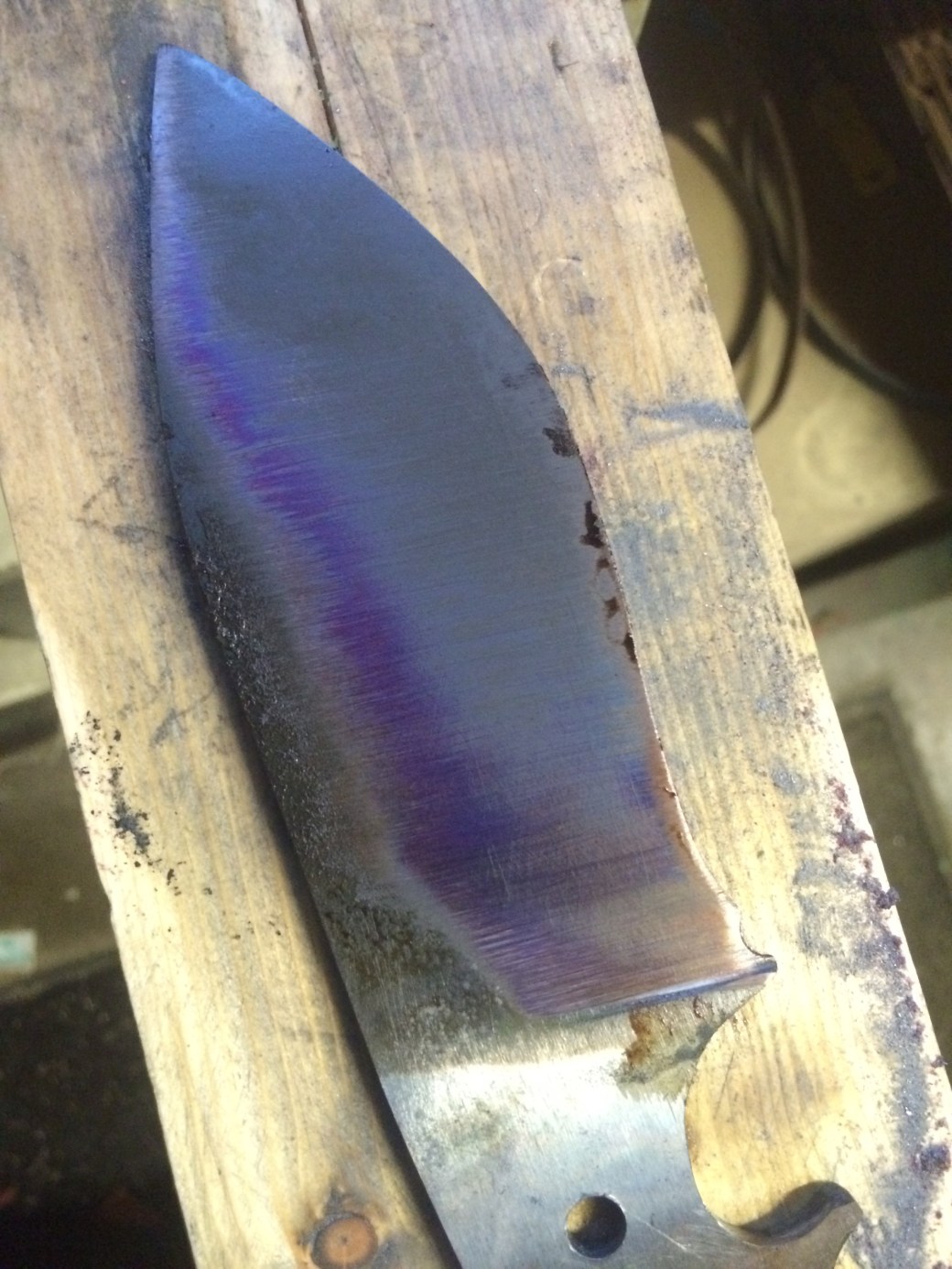 She is properly tempered- the blue near the spine of the blade means there is some flex and bend while the grey color near the cutting edge is hard and edgeworthy. Too much of one or the other and the blade will be brittle and prone to shattering, or won’t be hard enough to hold an edge. Proper balance is key…