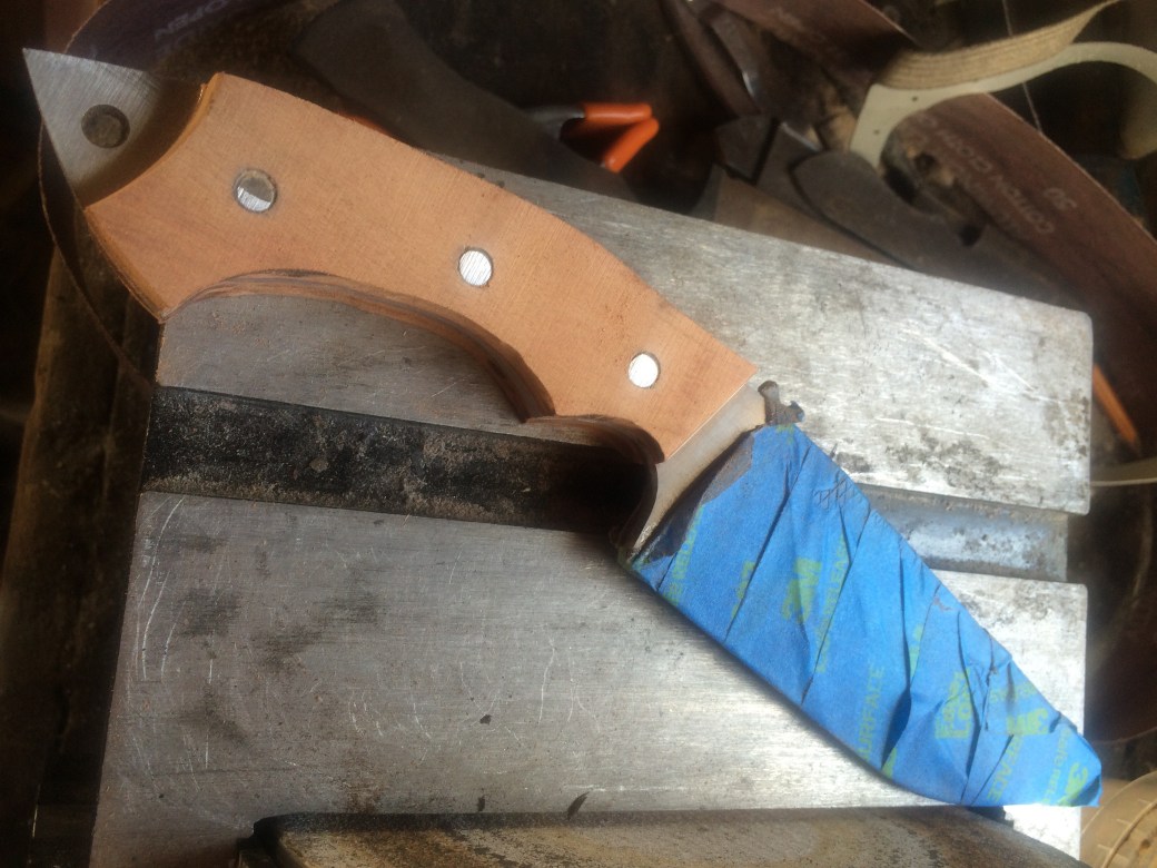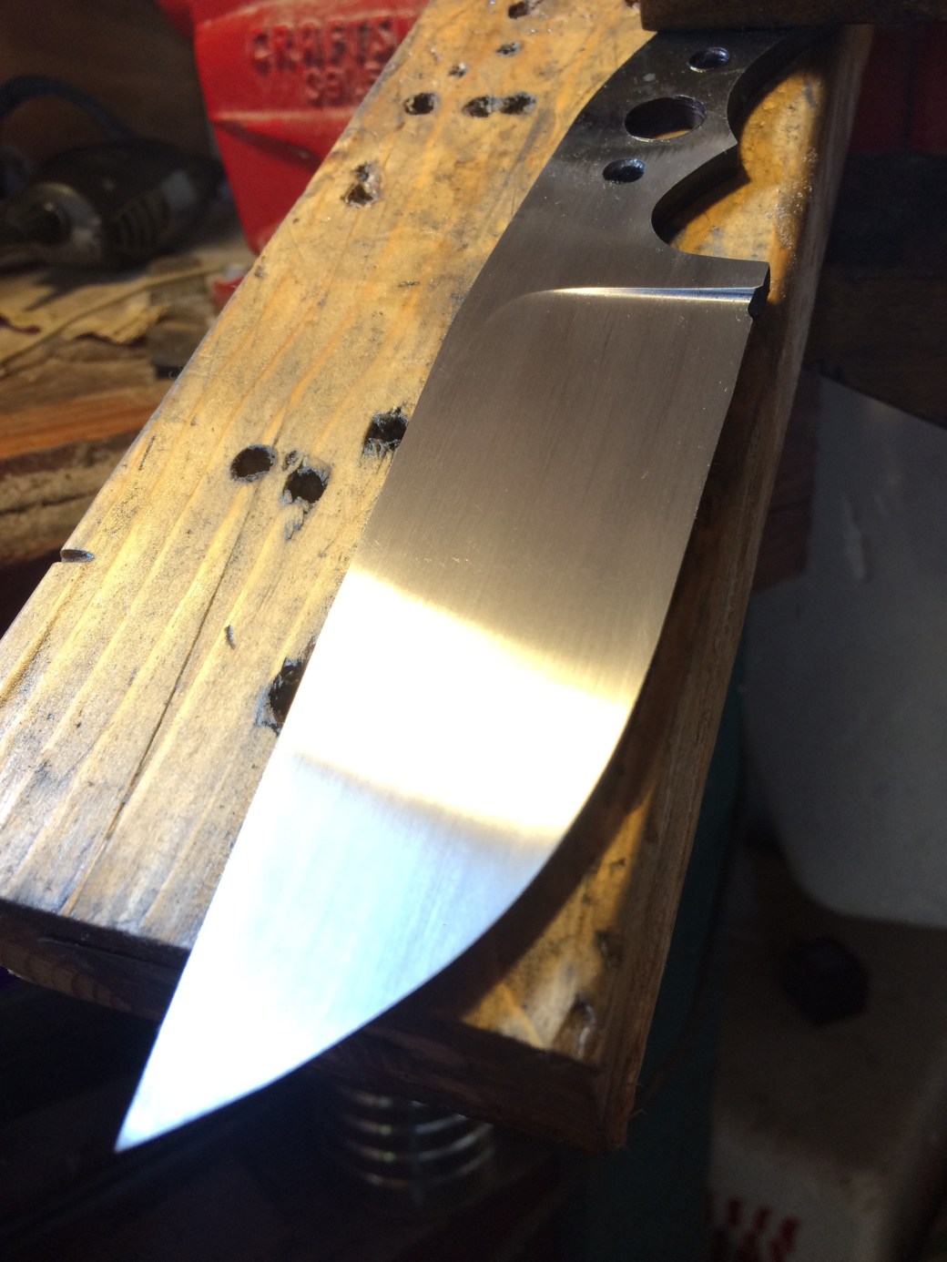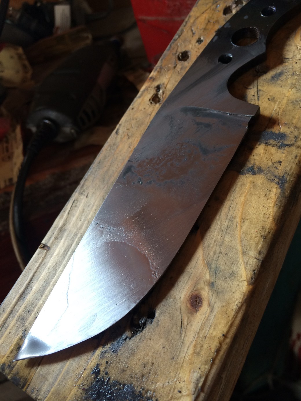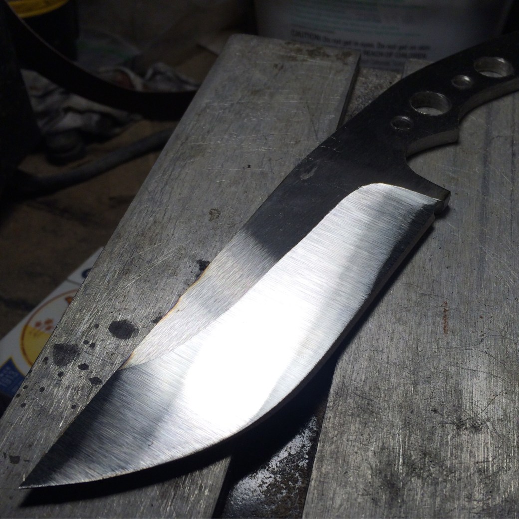 Sanding before heat treat. The more sanding you do on the soft steel, the easier it will be to sand when the steel is hardened.