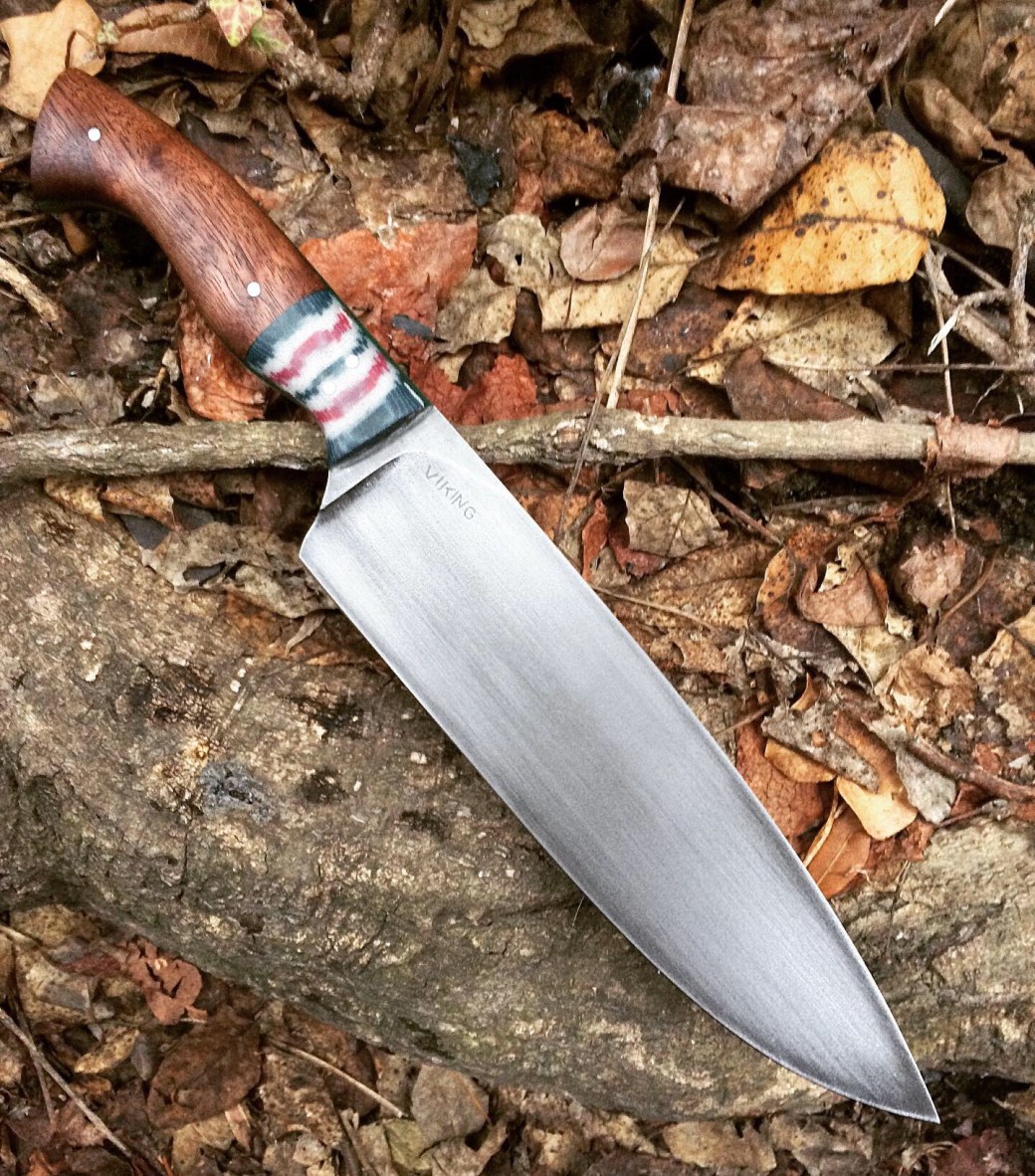 This knife was commissioned by a lady I went to college with for her husband, a former Cavalier Scout in the Army and a new father. I don’t have children but I imagine being a new father, where there are so many things out of your control, can be at odds with the capable nature of a military mindset. The intent of this knife, the Scout, is to put some of that at ease. I tried to capture that duality by marrying those two parts together. The handle was made from an old piece of Black Walnut trim molding- solid, seasoned, and strong. The bolster was made from their child’s blanket, which required a lot more care and work. The blanket contained a bit more uncertainty because I didn’t know how it would turn out till it was finished. Peppered in the blanket was one of the gentleman’s old Boy Scout badges to act as a guardian to that uncertainty.
