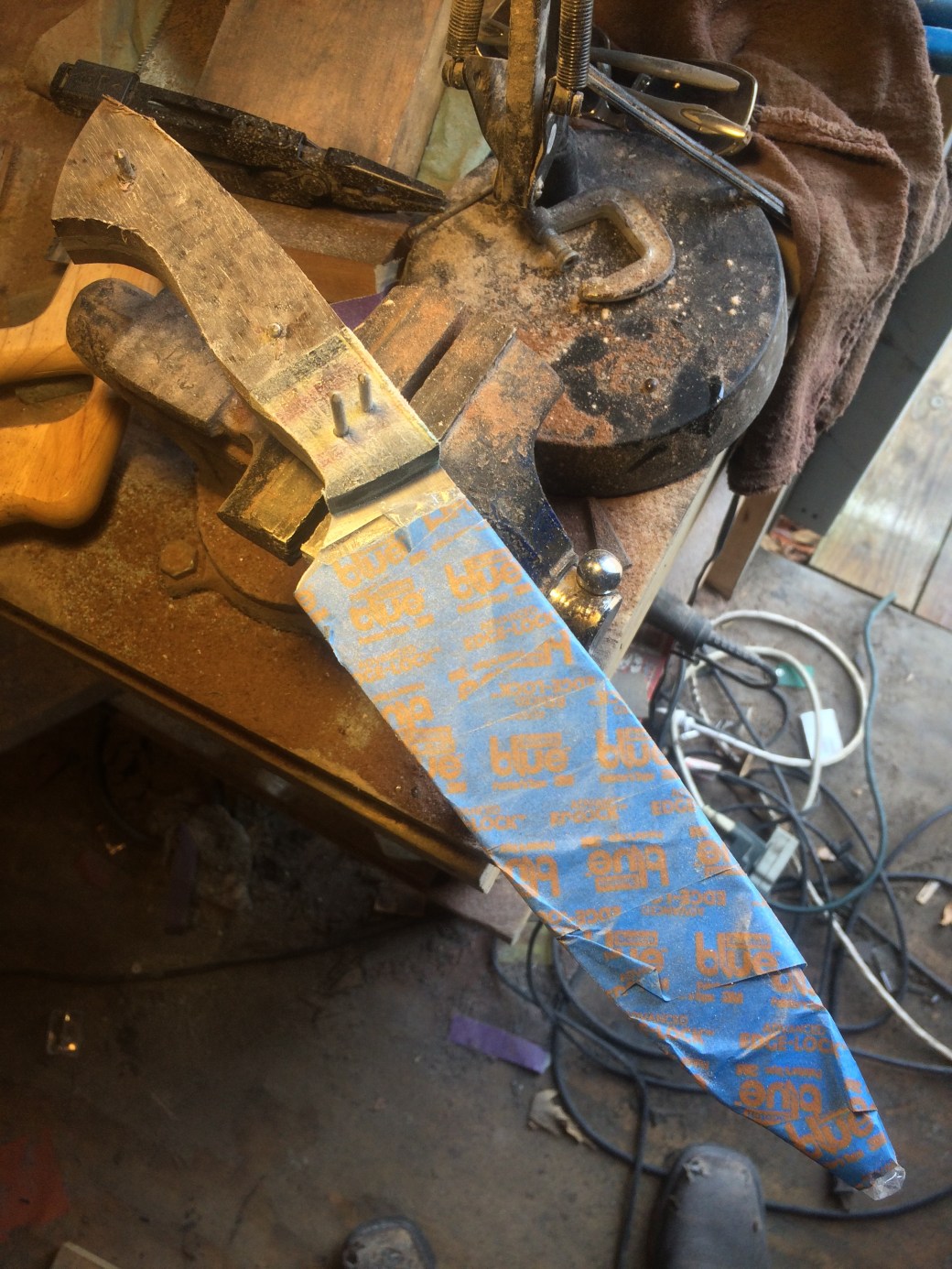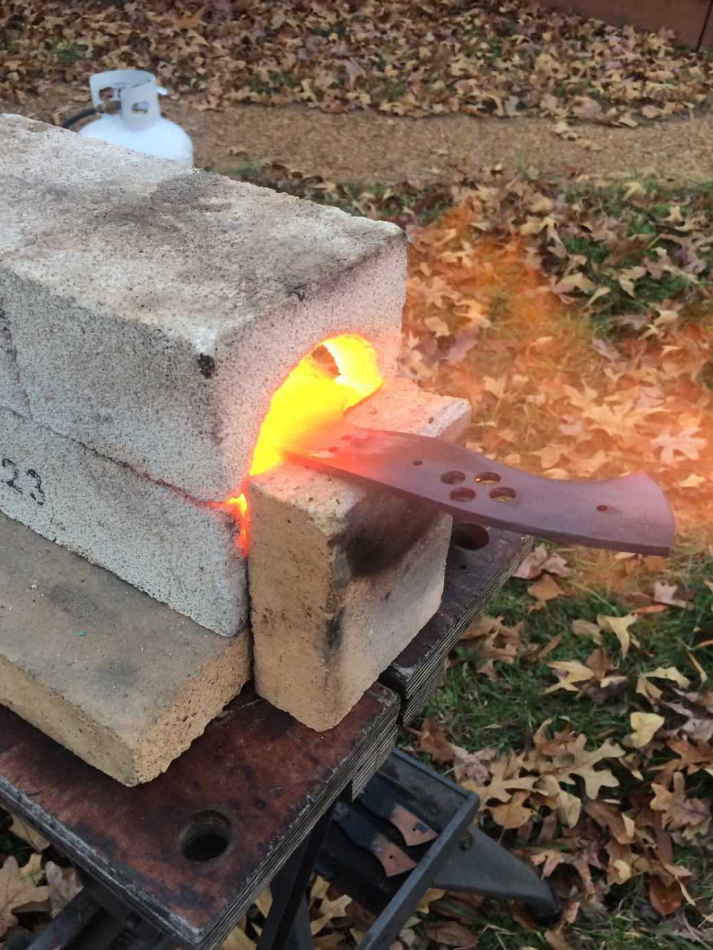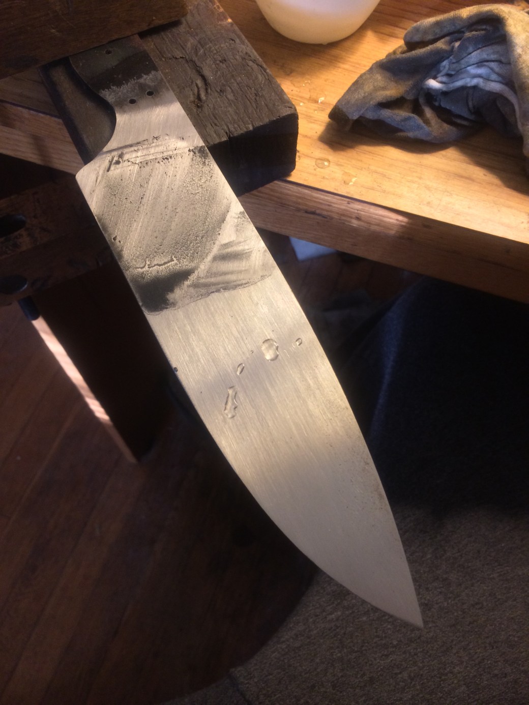 ….and despite our best efforts, warping does occur. Since the blade is still hot from the oil quench we have some time to correct it: