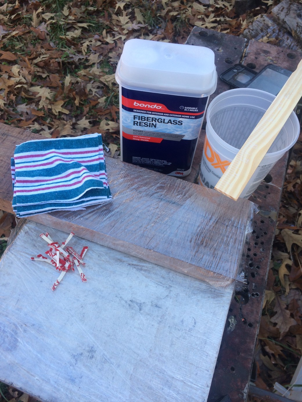 The blanket is cut into equi-sized pieces and the badge into slivers. Everything will be layered with fiberglass resin and smashed together: