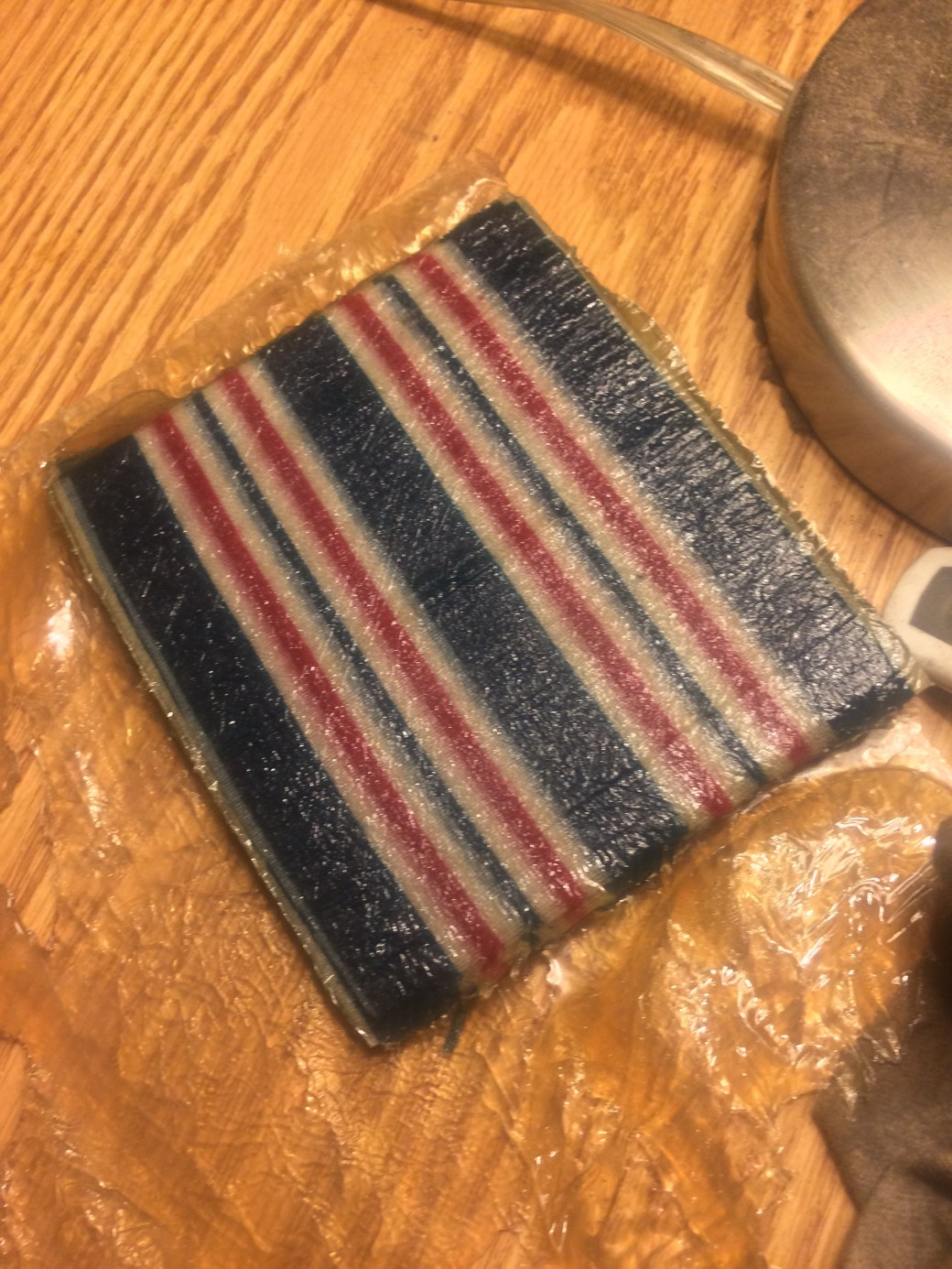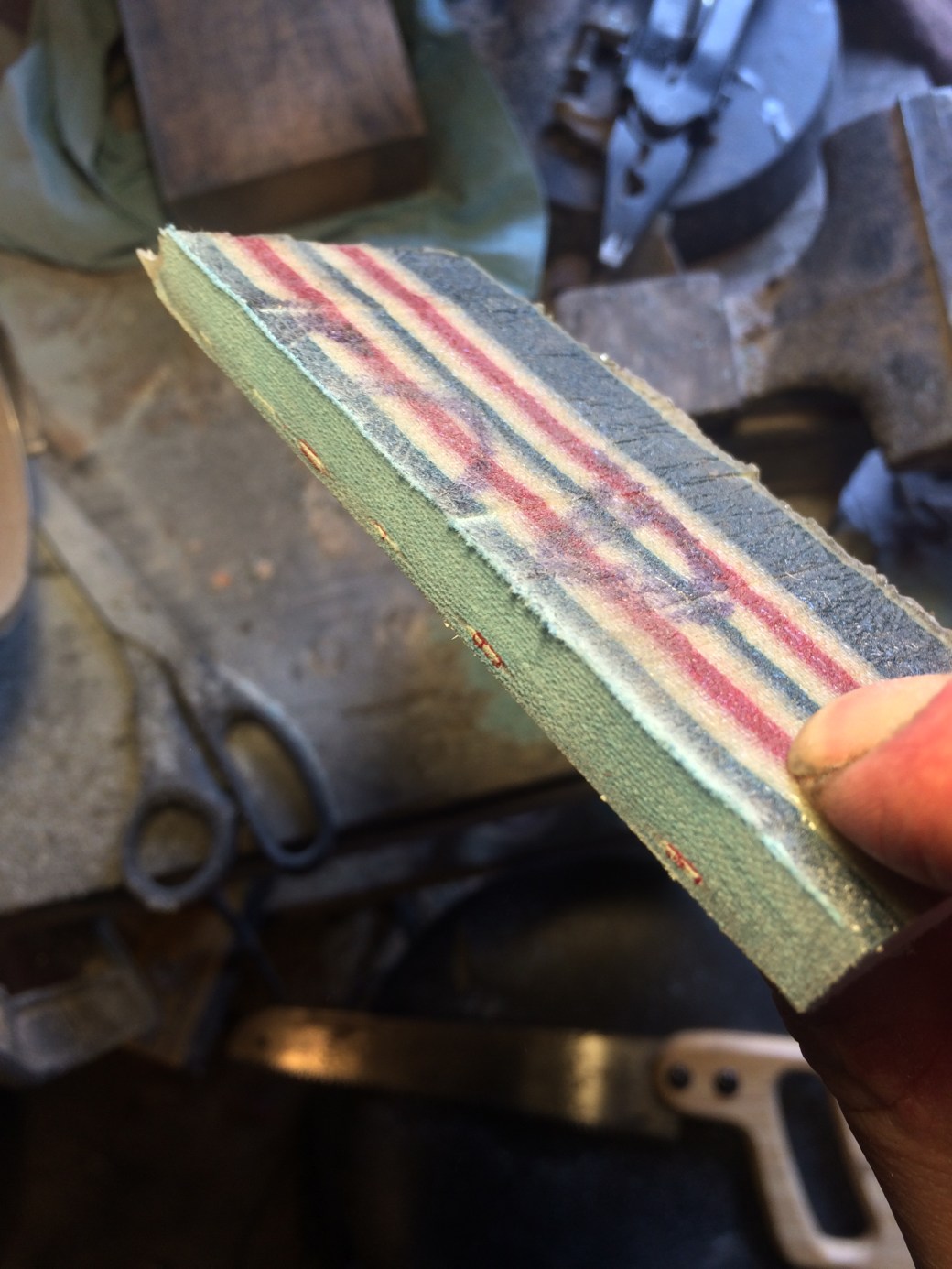 A cross-section of the material and you can see the scout badge slivers. This has become one piece of material: