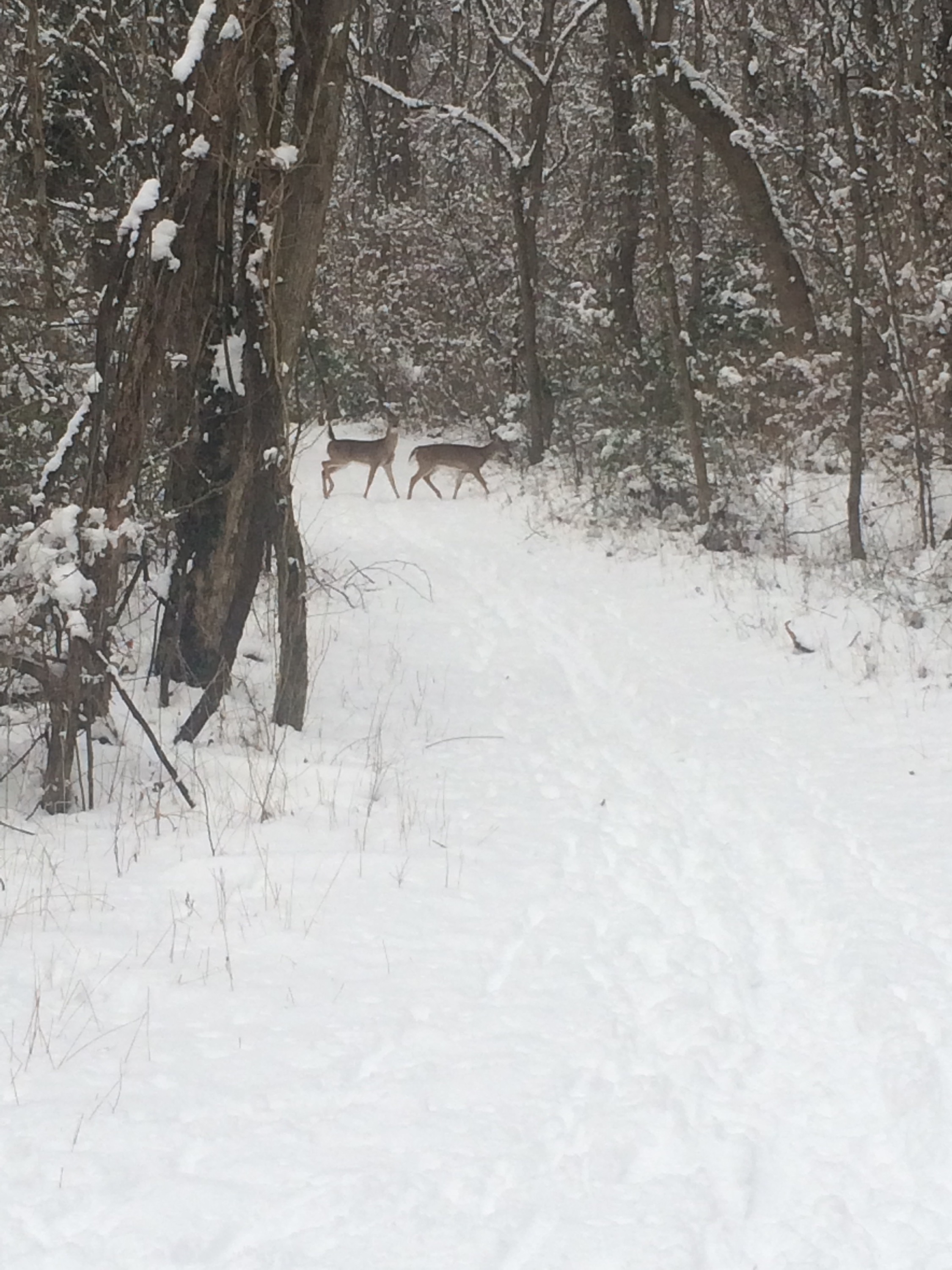 There were deer out today.  I’m sure they are out everyday but they are especially conspicuous in the snow.  I really wanted a picture, because seeing deer running through the snow doesn’t happen in my world as often as I’d like.  They are fast.   I walked some more.  After awhile there was a deep moment of stillness and this happened: