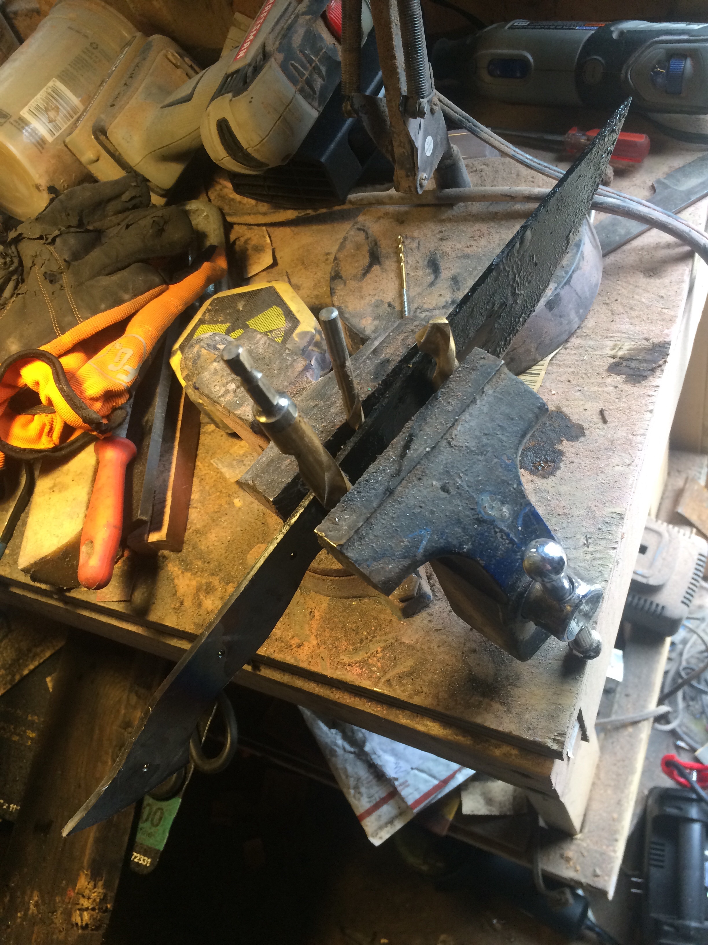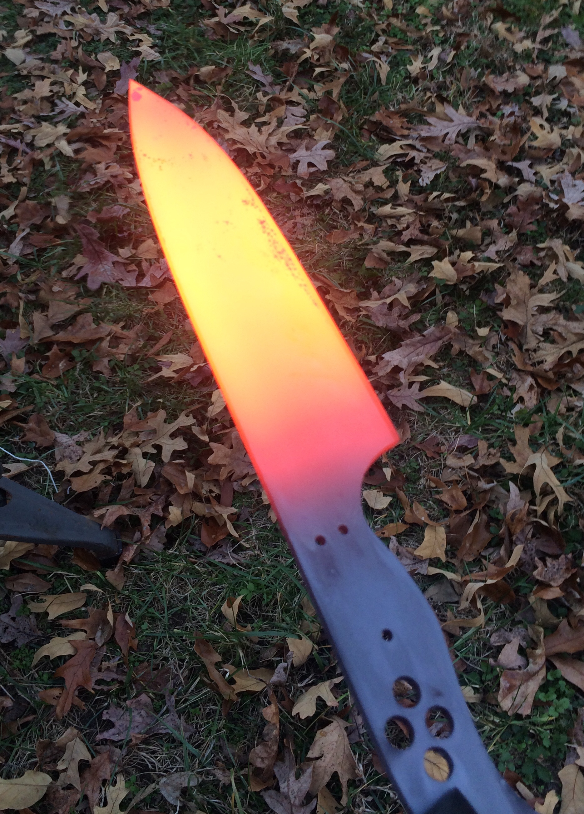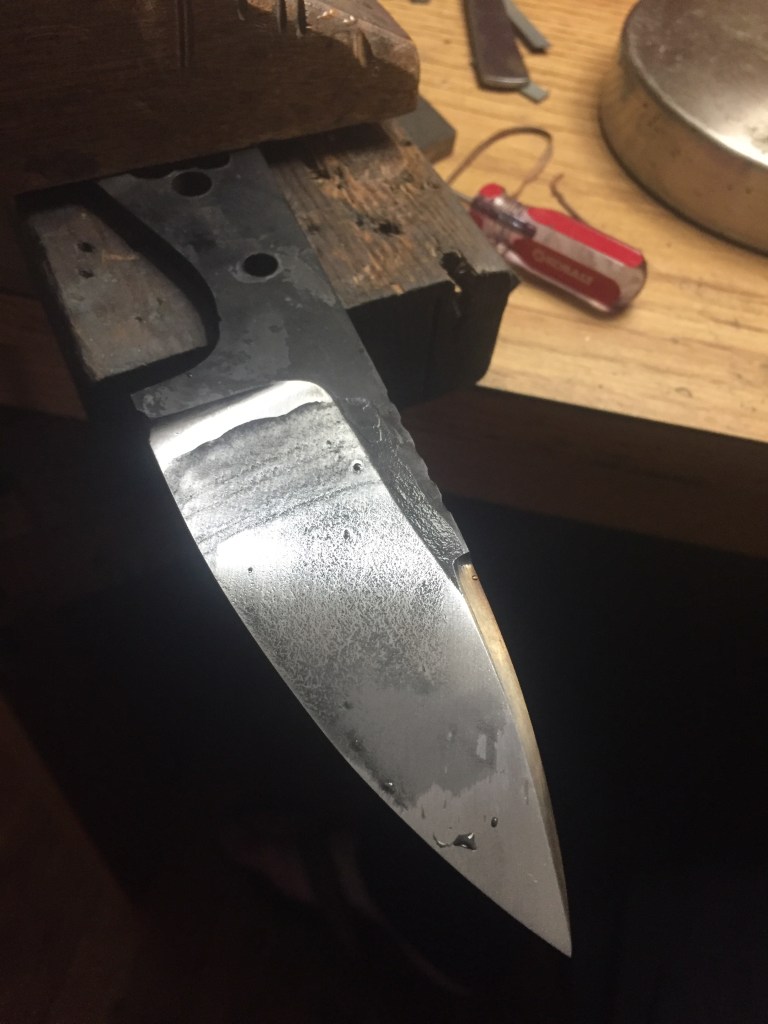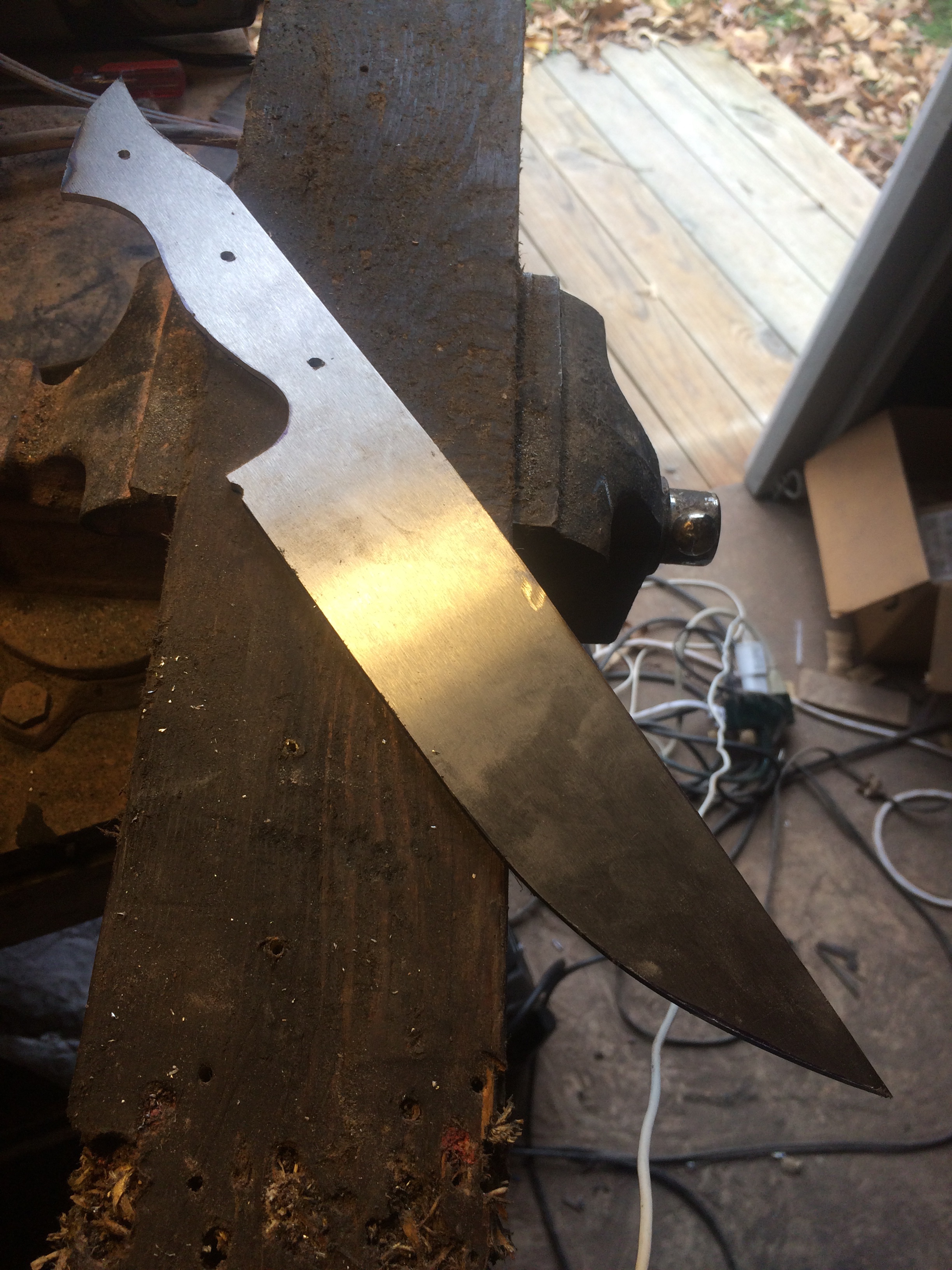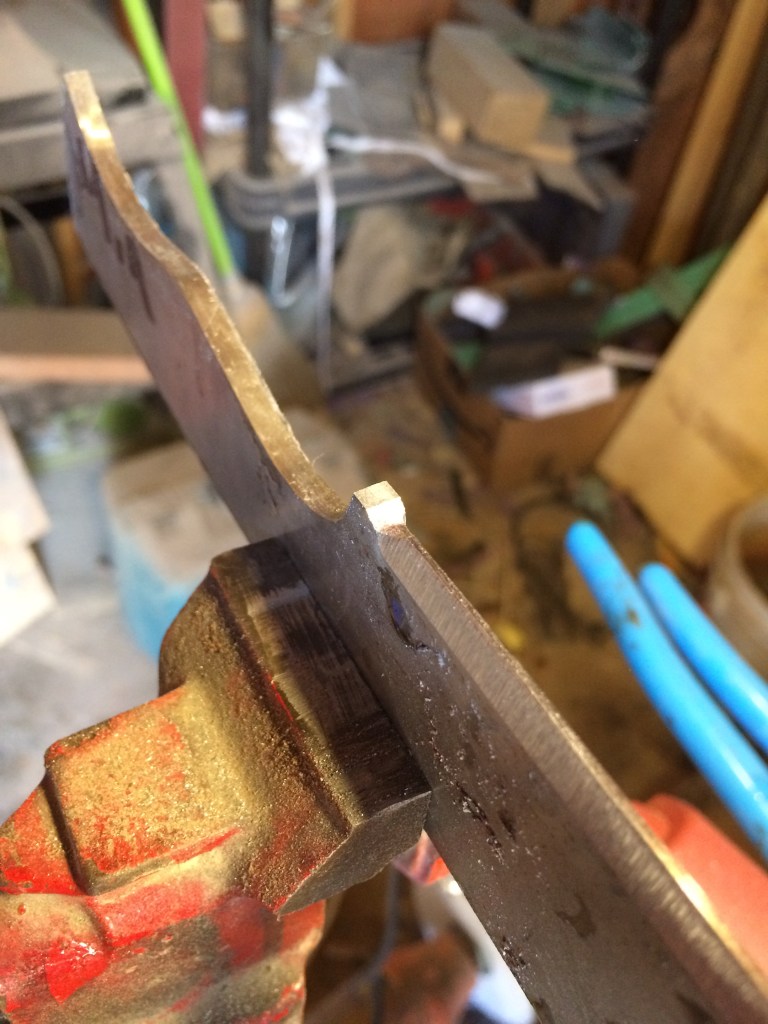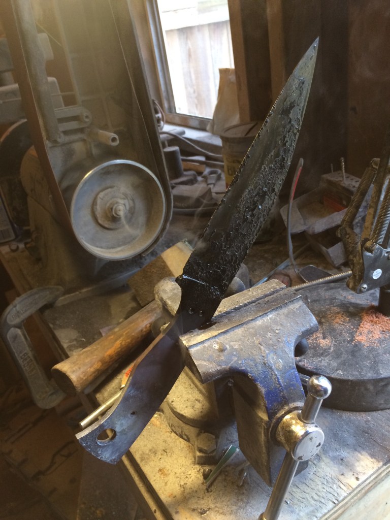 ….and despite our best efforts, warping does occur.  Since the blade is still hot from the oil quench we have some time to correct it: