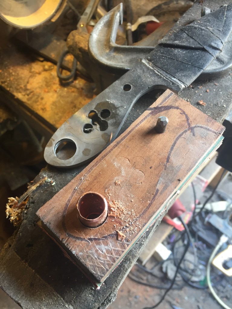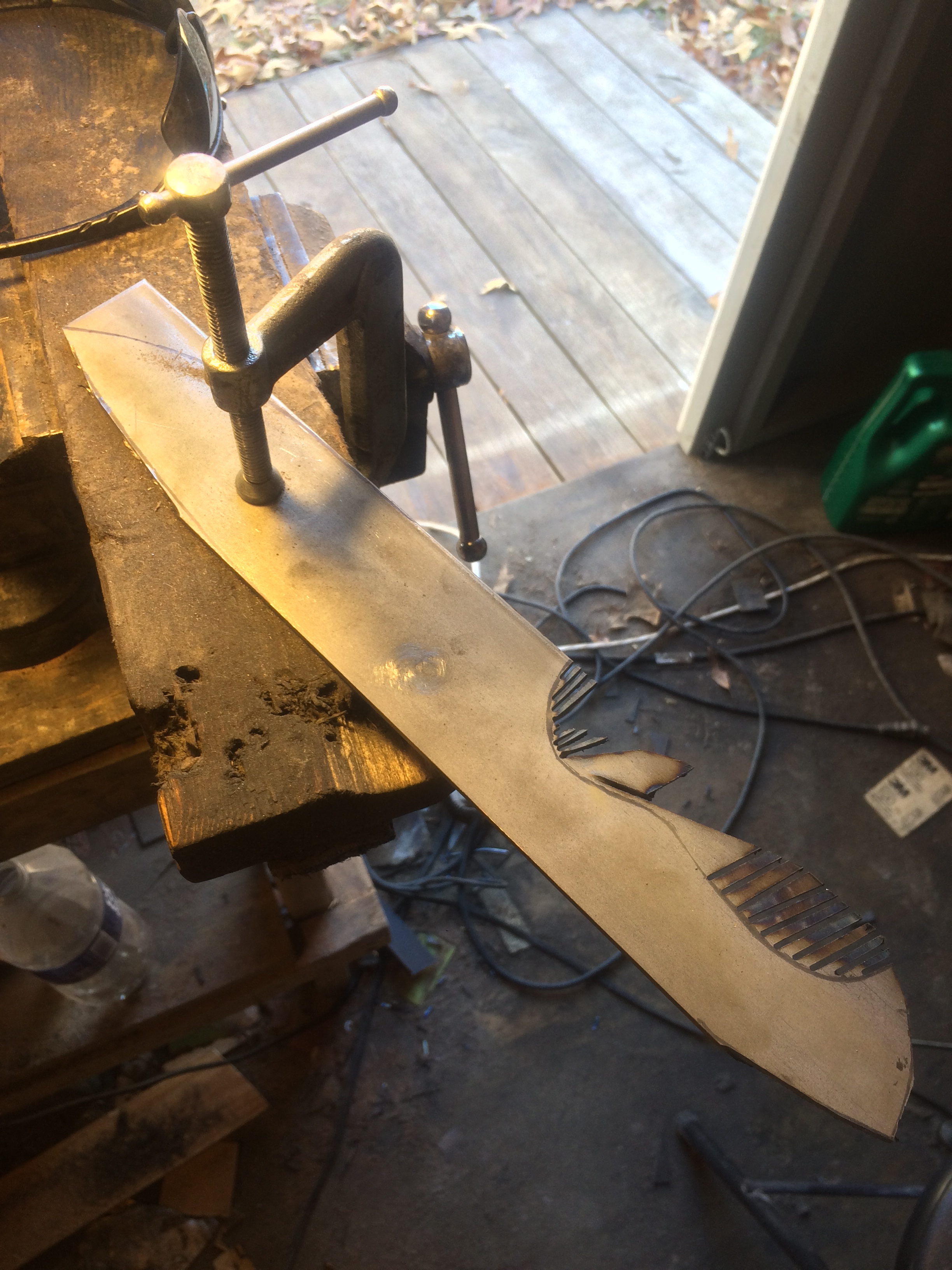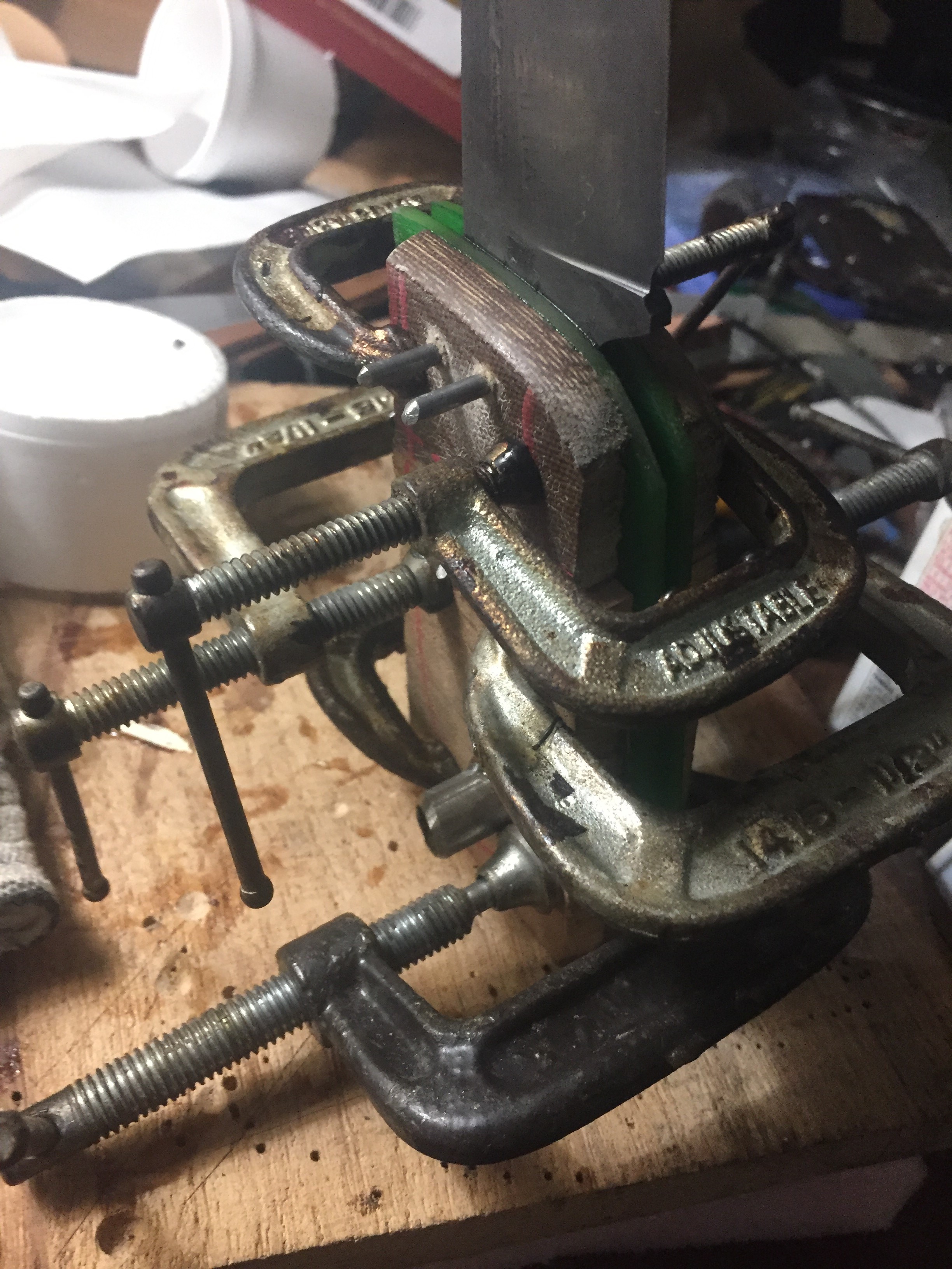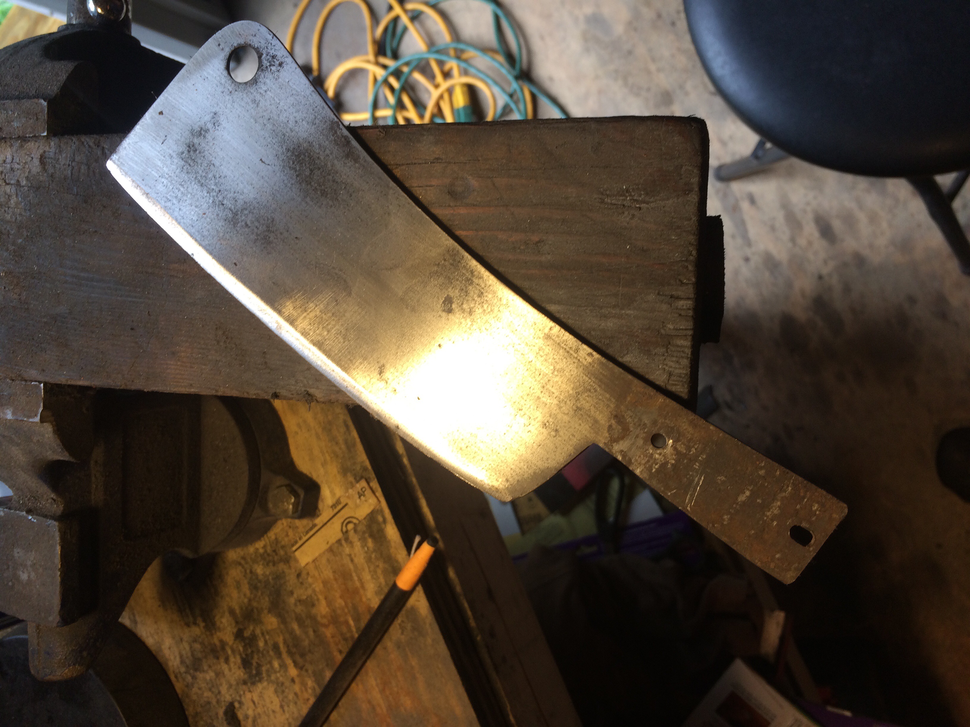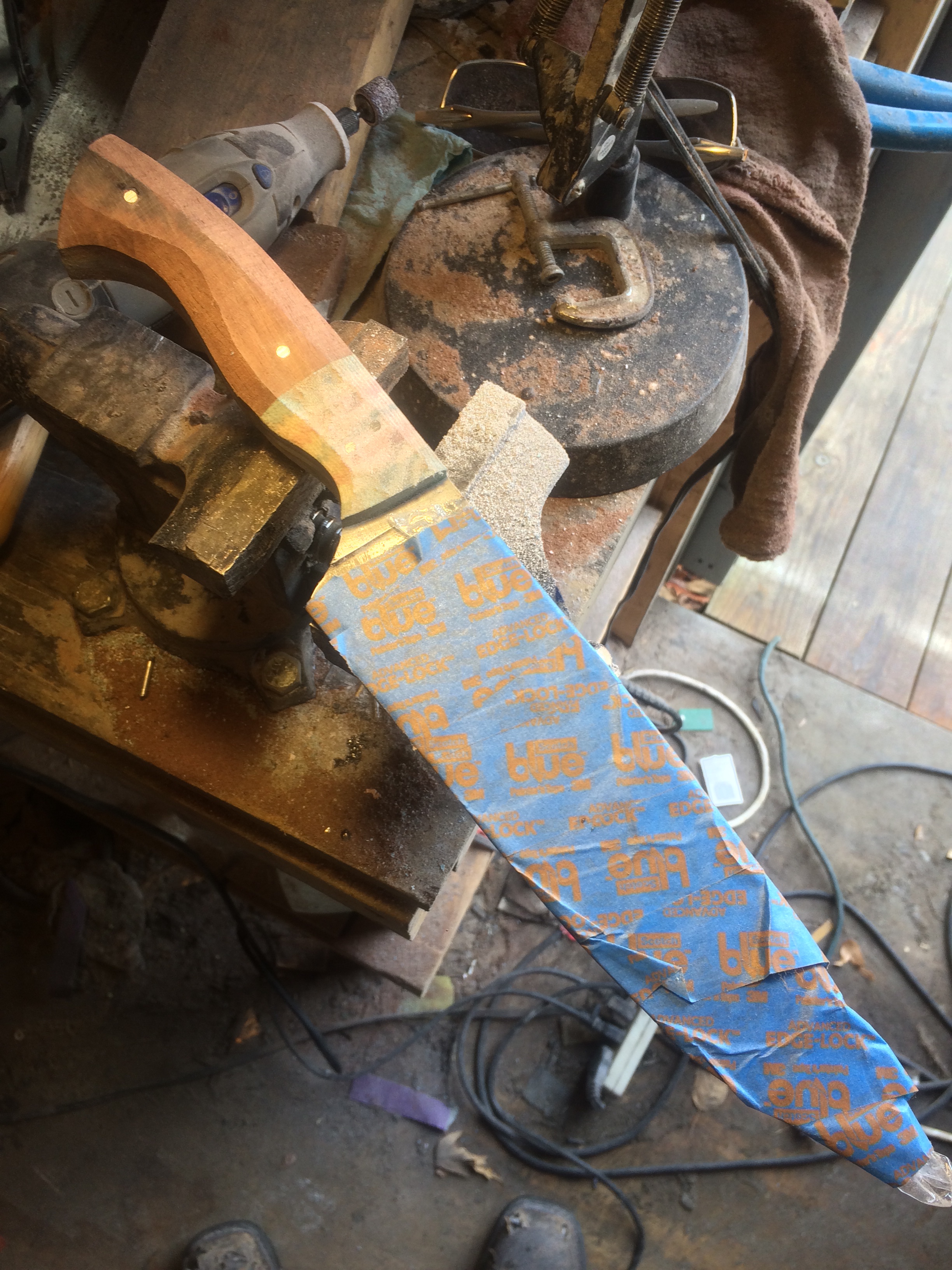 ….and despite our best efforts, warping does occur.  Since the blade is still hot from the oil quench we have some time to correct it: