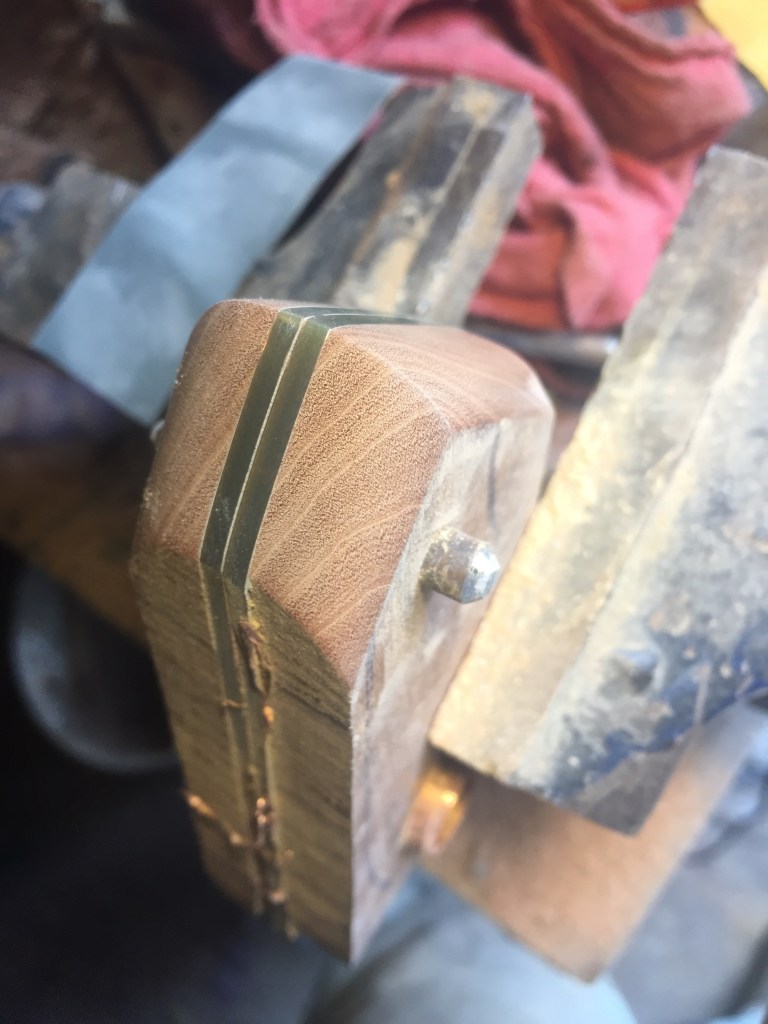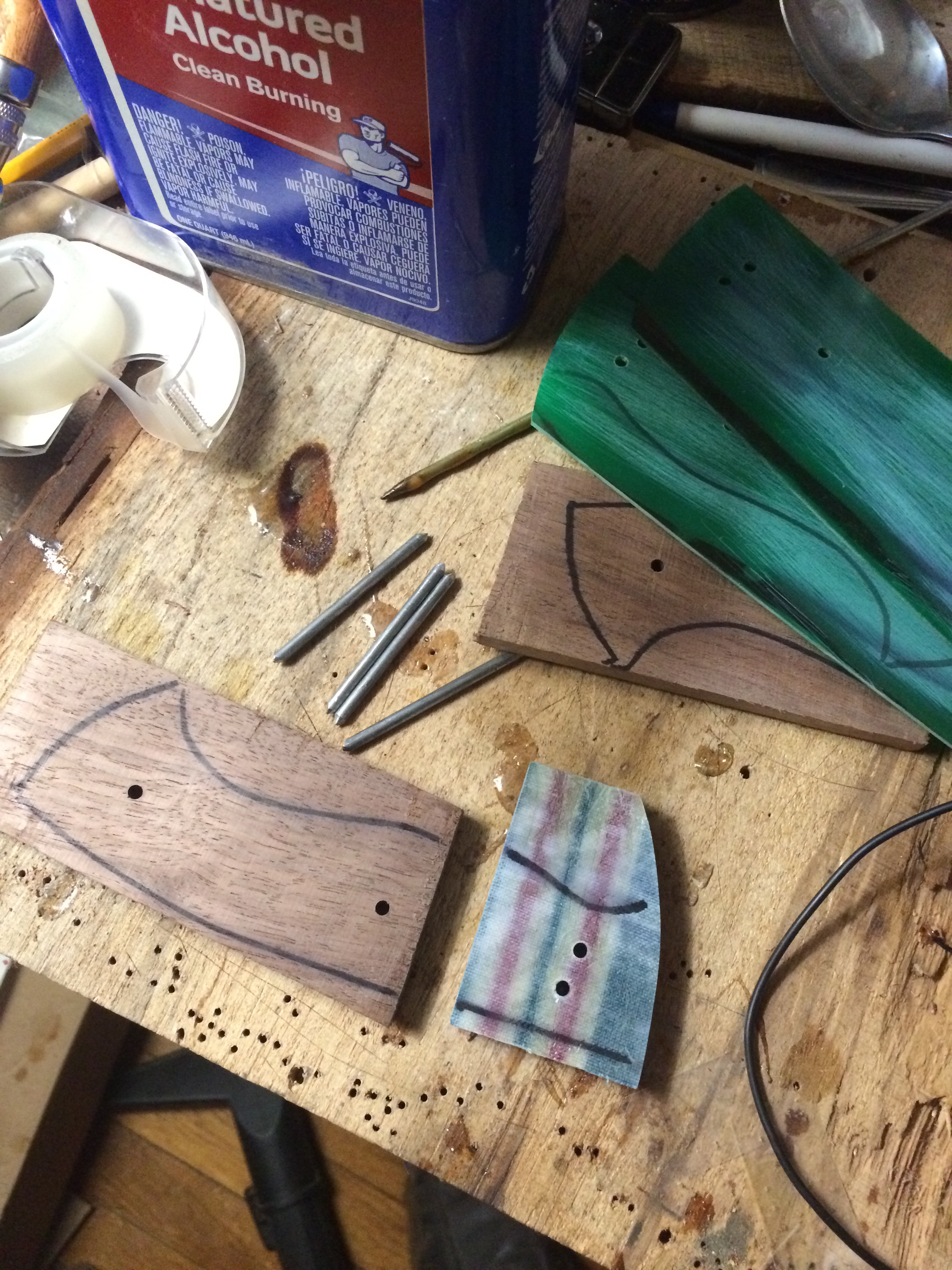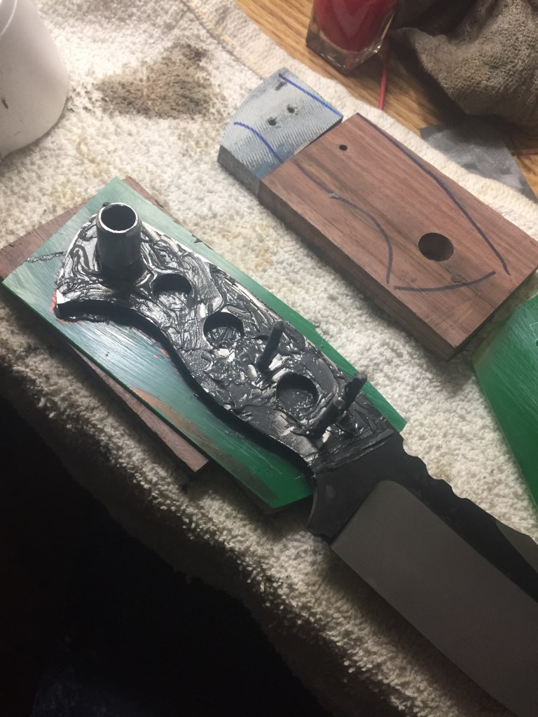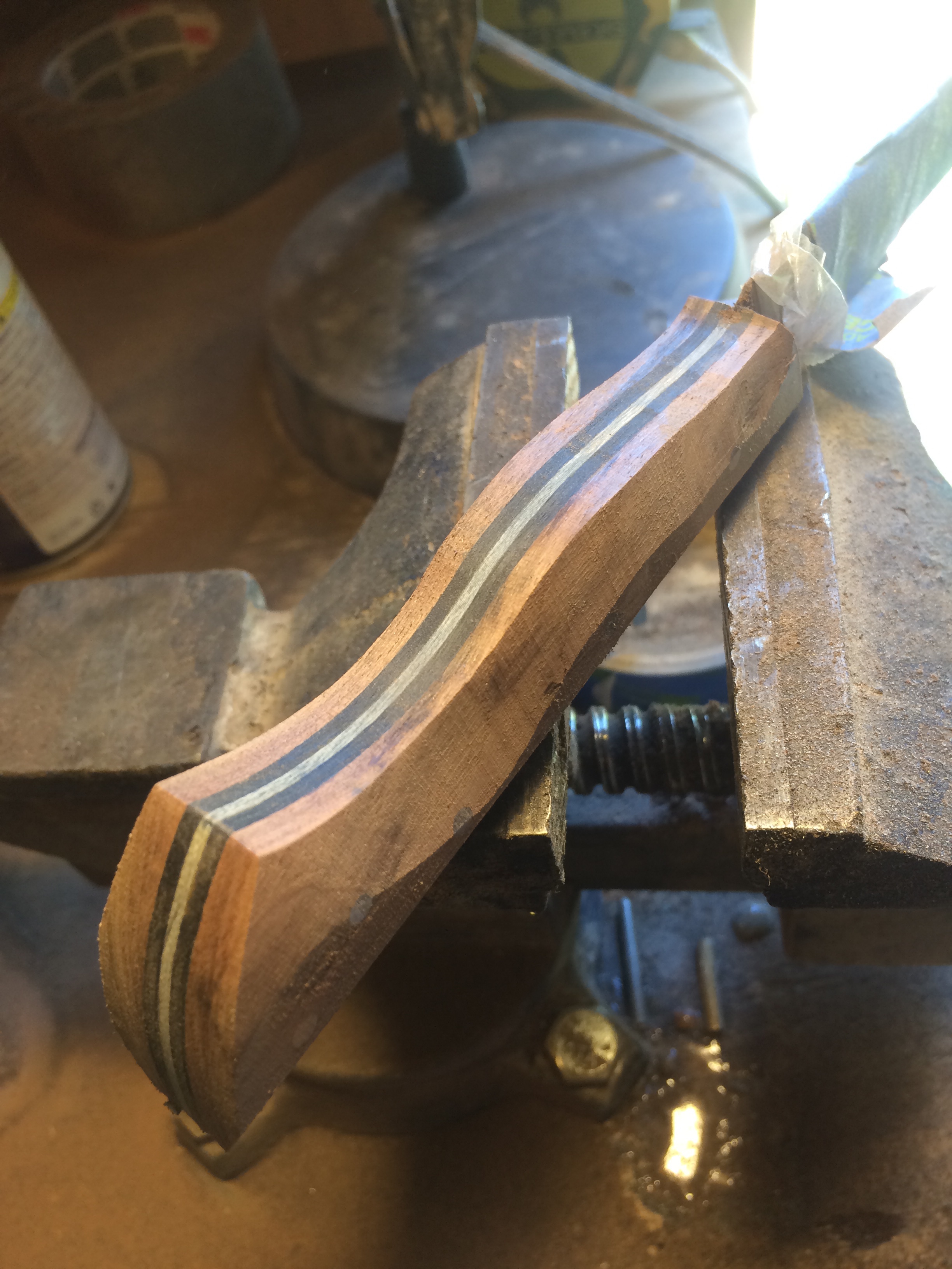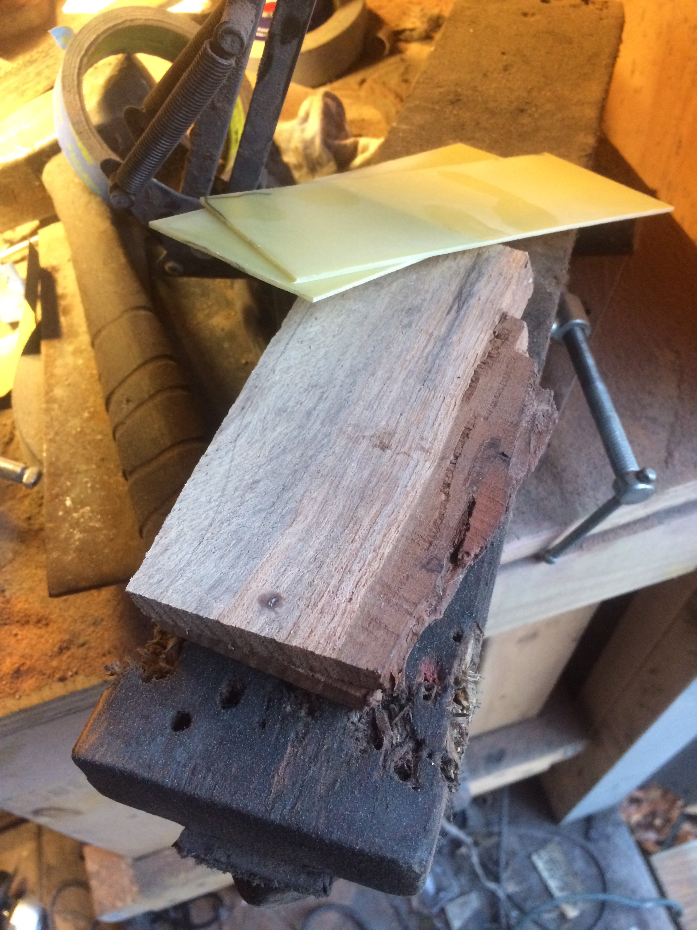 I cut two pieces of it and fit it to the knife. For a bit of color contrast, I use a bit of fiberglass computer board blanks that I rescued from a dumpster-