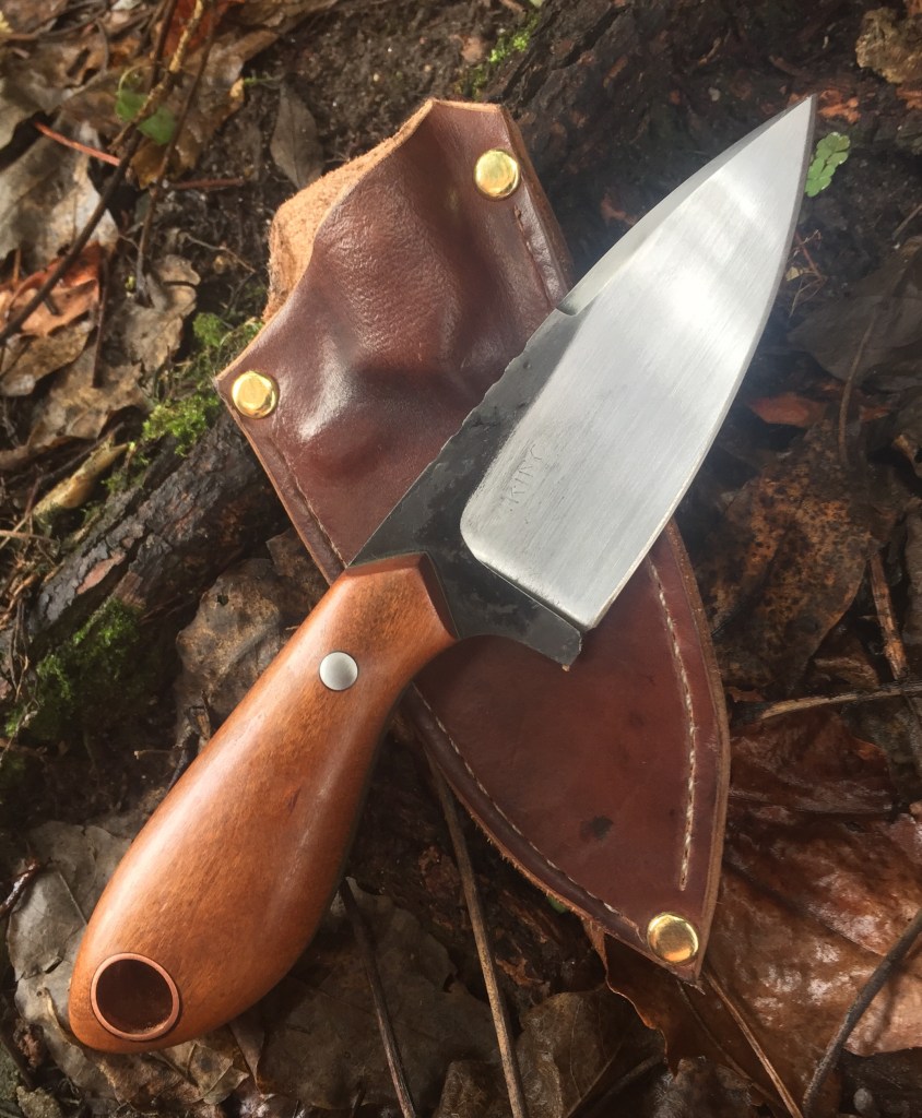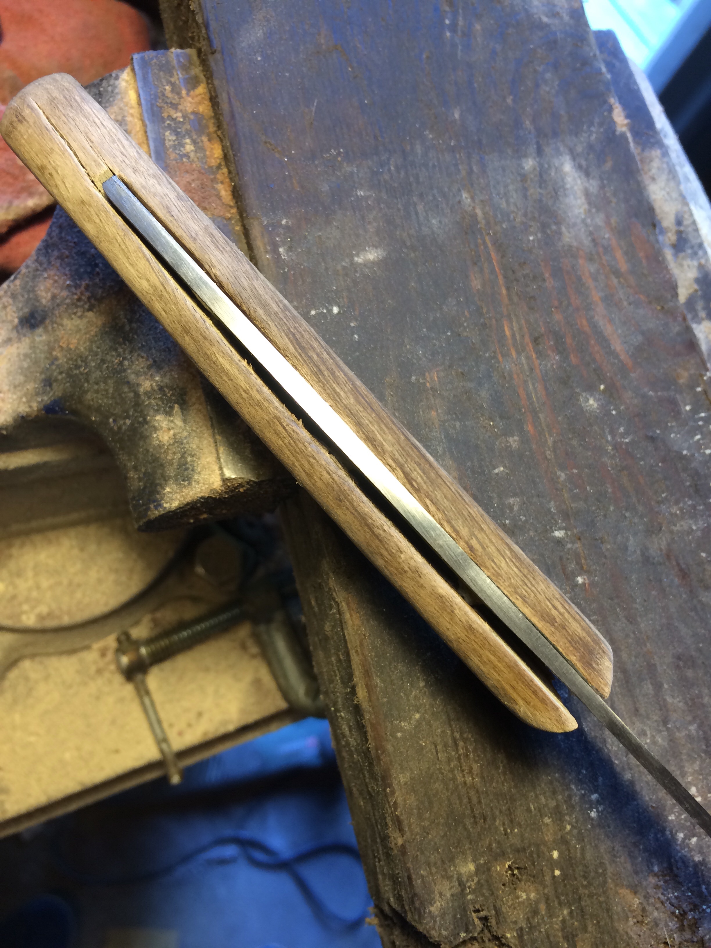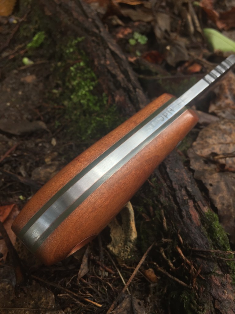 I make a lot of these particular knives. Anytime I see a bedframe in the trash, I pick it up and take it to my shop. Not all bedframes make good little knives but enough of them do so that it becomes worth my while to pick them up. It is through these little knives that I can explore and just be curious. I use whatever I have lying around the shop for the handles, or I try out ideas, or I just tinker around with no particular goal in mind to see what will happen. Sometimes nothing happens, but sometimes I can make something special that didn’t exist before I made it.