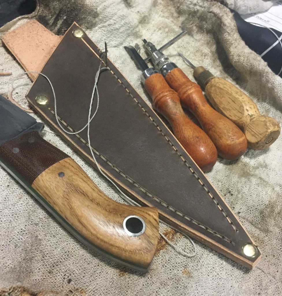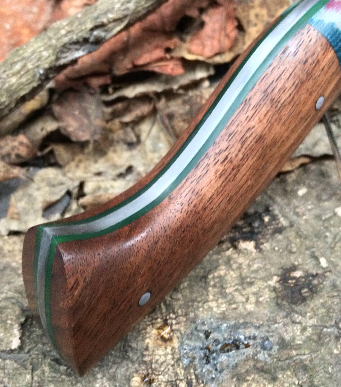 This knife was commissioned by a lady I went to college with for her husband, a former Cavalier Scout in the Army and a new father.   I don’t have children but I imagine being a new father, where there are so many things out of your control, can be at odds with the capable nature of a military mindset.  The intent of this knife, the Scout, is to put some of that at ease.  I tried to capture that duality by marrying those two parts together.  The handle was made from an old piece of Black Walnut trim molding- solid, seasoned, and strong.  The bolster was made from their child’s blanket, which required a lot more care and work.  The blanket contained a bit more uncertainty because I didn’t know how it would turn out till it was finished.  Peppered in the blanket was one of the gentleman’s old Boy Scout badges to act as a guardian to that uncertainty.