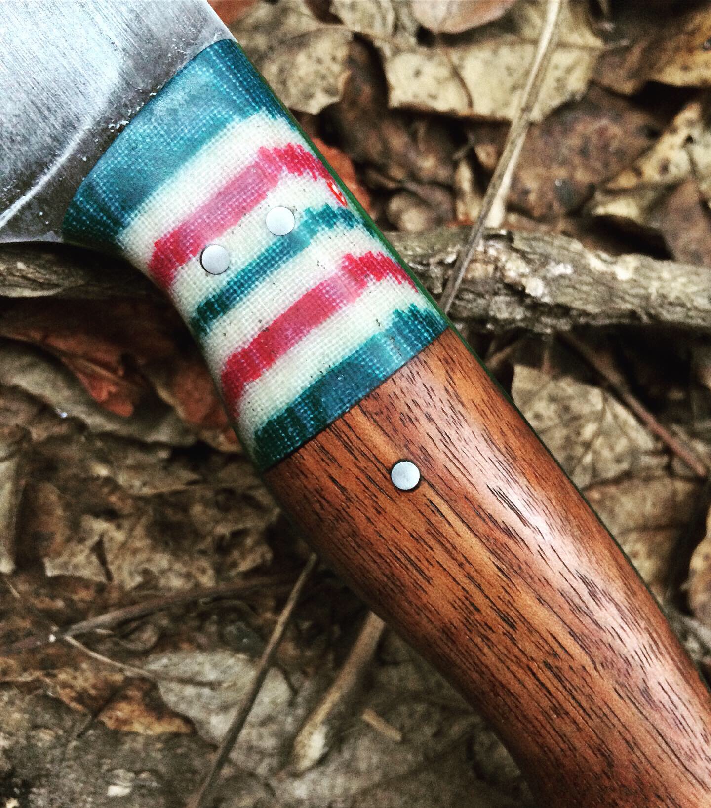Puttin’ on the Fritz is made of high carbon steel, which means it will take a keen edge, hold it a good while, and will be easy to sharpen. It will stain and patina and tell the stories of the places you’ve been- this natural and characteristic of the steel. It came to you coated in EEZox gun oil, an oil based film that protects the finish. Your knife is made to be used so don’t be shy about getting it dirty. Be sure to keep your knife clean and oiled when not in use. Should you find any unpleasant surface oxidization you can remove it easily with a lightly oiled bit of 0000 steel wool, or a coarse rag with a bit vinegar on it.