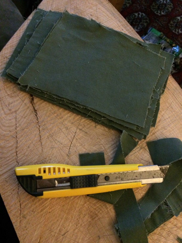 The blanket is cut into equi-sized pieces and the badge into slivers.  Everything will be layered with fiberglass resin and smashed together: