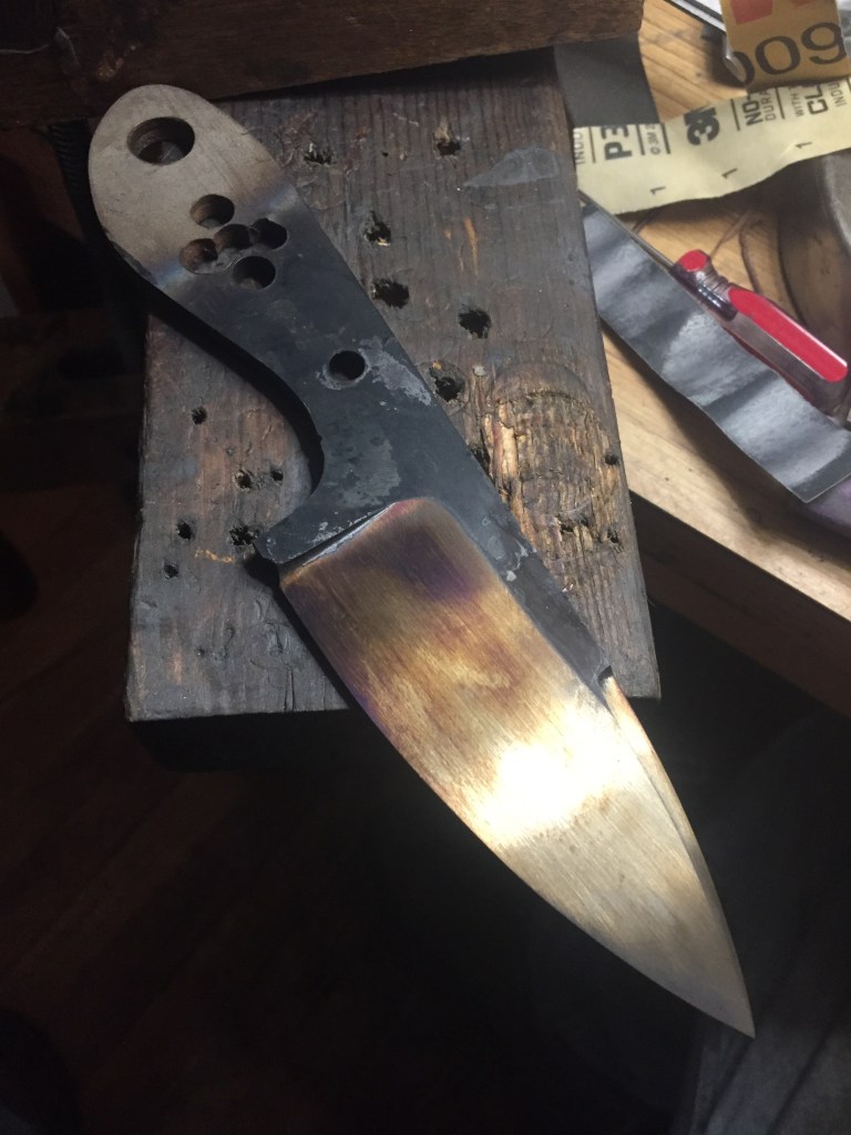 Then they go into the forge, a controlled fire that gets the steel very hot and hardens the blade. It gets so hard that sometimes it’s difficult to drill holes for the handle pins-