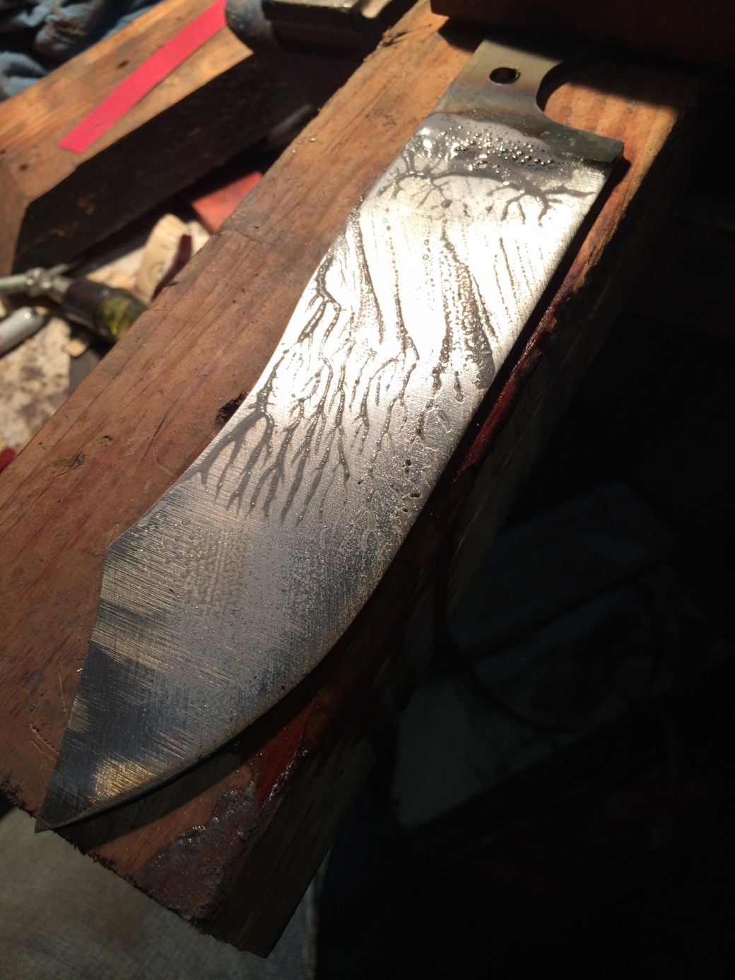 The Rio Bravo: etched 1095 spring steel, Texas Mesquite handle, leather and tin spacers, with steel hardware.