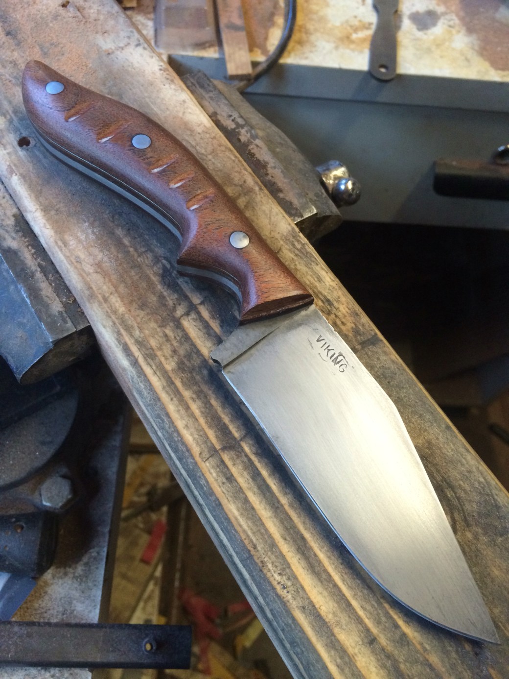 I felt quite a bit of anxiety in making this blade. I had to design it and give it a life for somebody’s loved one whom I had never met before. It took a very long time because I really wanted to make the right statement. The recipient of this blade is a man’s man, stoic, and has taken his licks. He has a bit of cowboy in him- John Wayne was mentioned during our talk. I named it the Rio Bravo after the John Wayne film. Wayne was 51 when he starred in the film but still kicks a lot of ass.