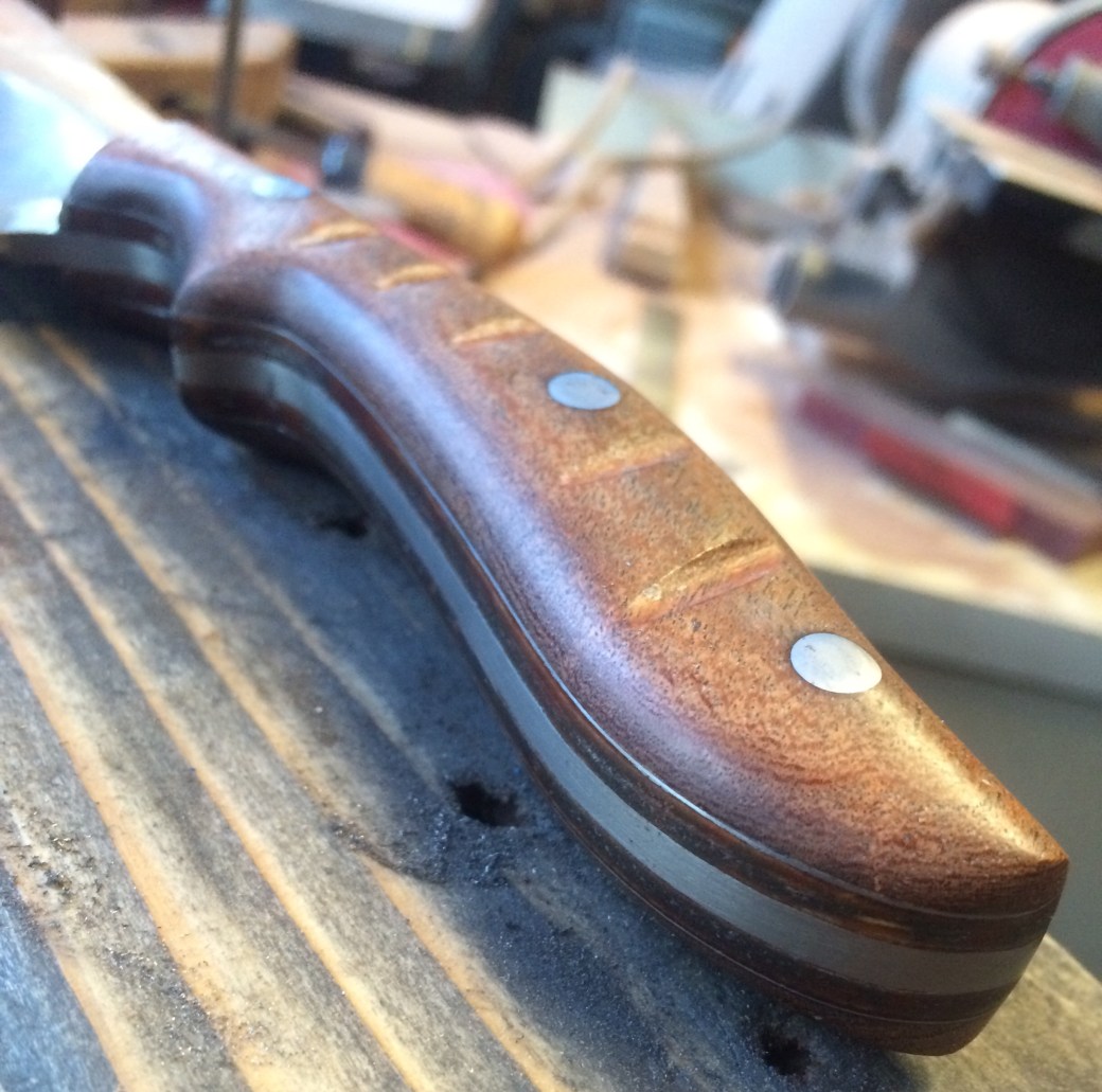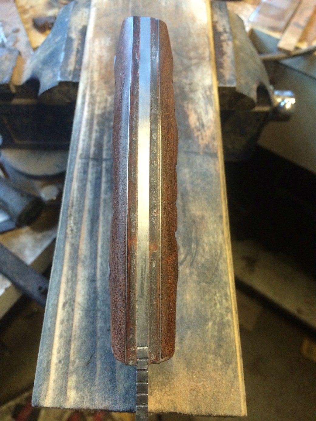 I have a cousin in Texas who is a woodturner with a sawmill. He handpicks cutoffs with the most gorgeous figures and sends them to me. When I’m using his wood for a handle it’s like Christmas morning- think of opening your favorite Christmas present, only you get to do it for two and a half hours. Thank you Bill Cockrell. You are a very good man.