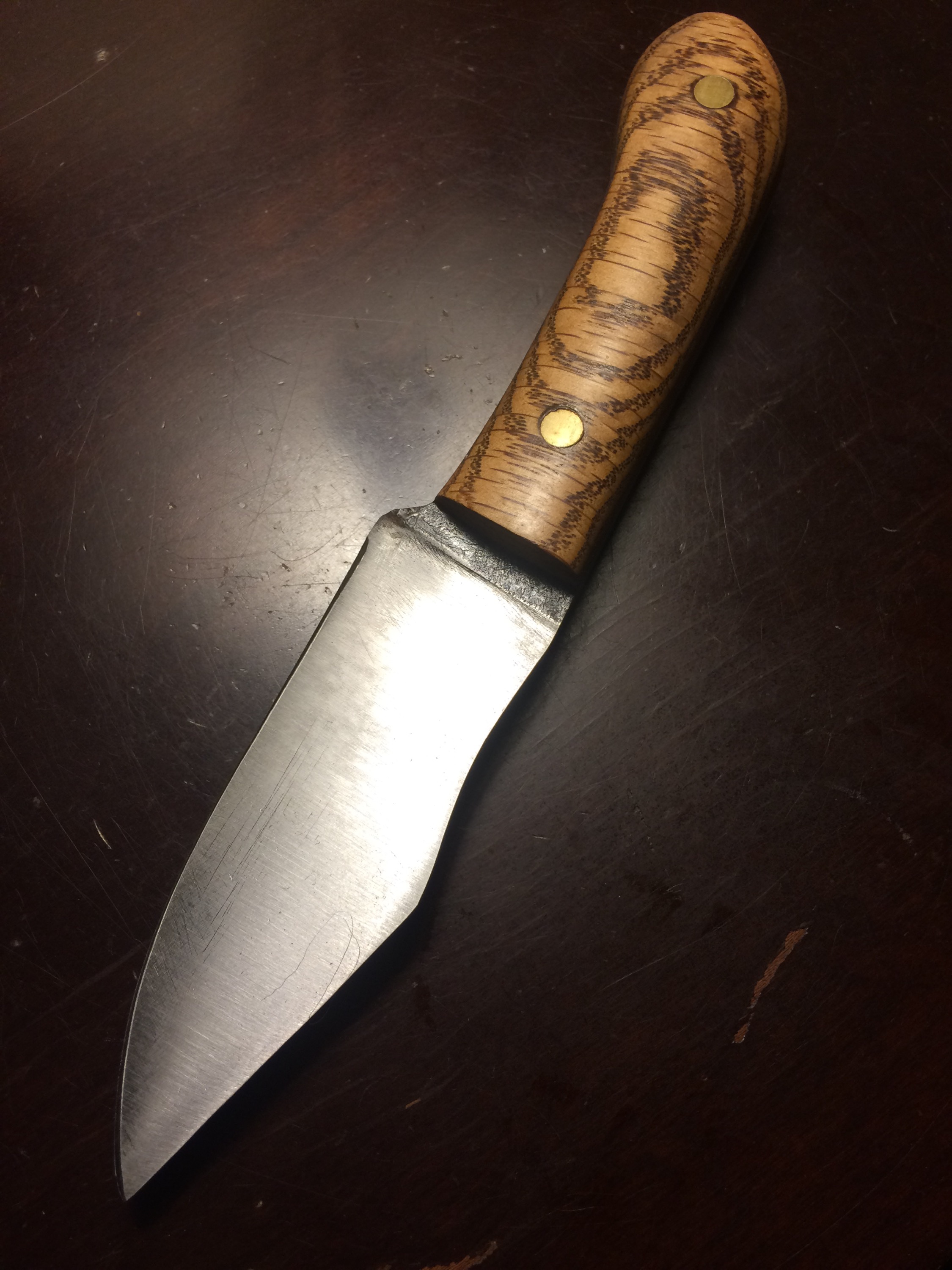 The Spellcaster was a lesson in faith- I wasn’t sure if it would even turn out.  I loved the idea that the steel came from a bedframe but I wouldn’t know if it would harden and temper properly till I had put in a lot of work on it.  It did.  I’ve been working on this blade a long time off and on and finally, like many things in life, I just had to take a leap and just go for it.  It is a thinner blade, very nimble and made for a smaller hand (well, smaller than mine….)