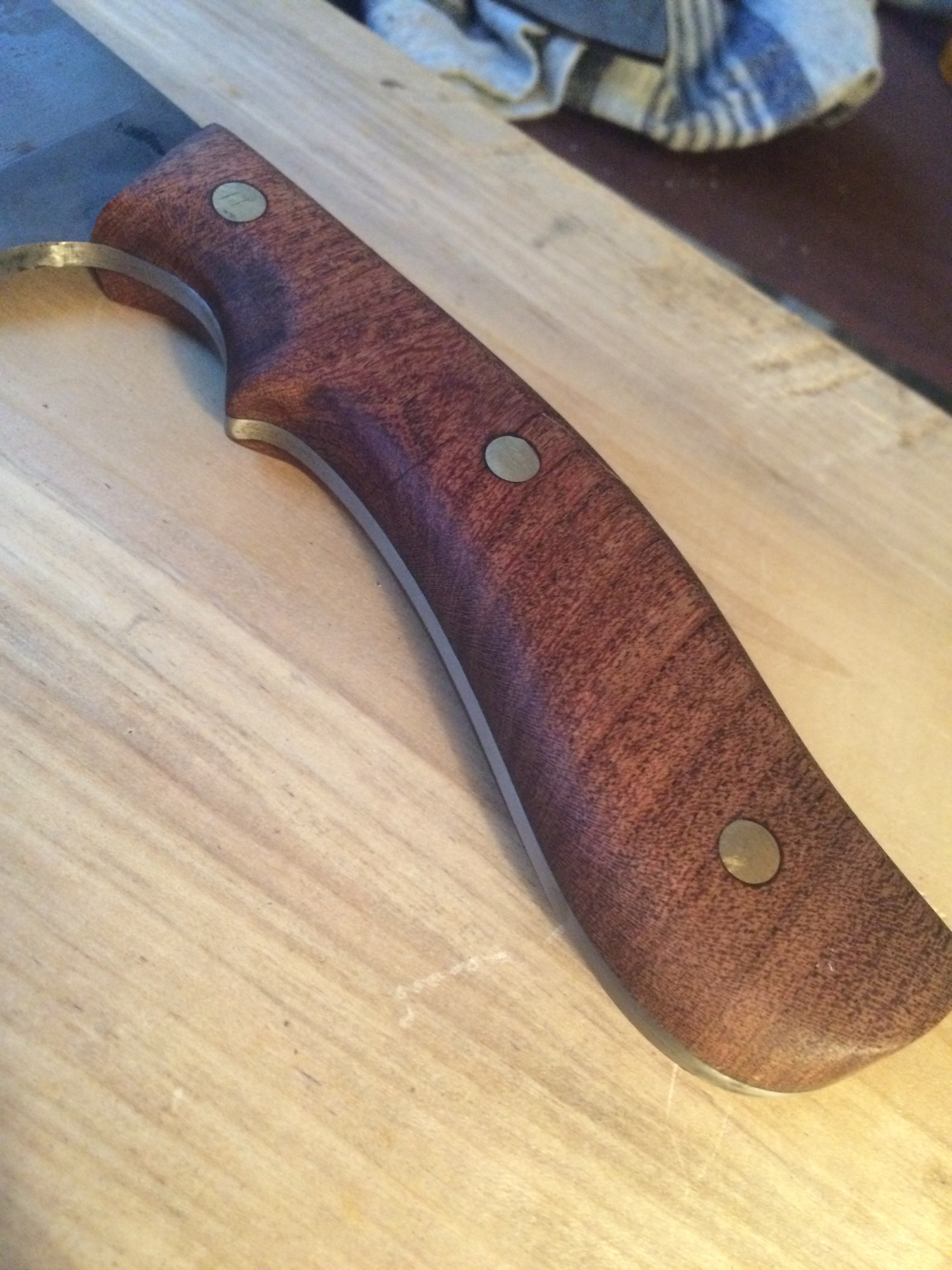Getting back into the shop has been scary, and a slow process.  I was in the middle of this knife when I injured myself and I had to keep emailing the client to push back when I would have it finished.  I did all of the woodworking and leatherwork with eight fingers.  It’s been an exercise in leaning into fear and getting back on the horse.