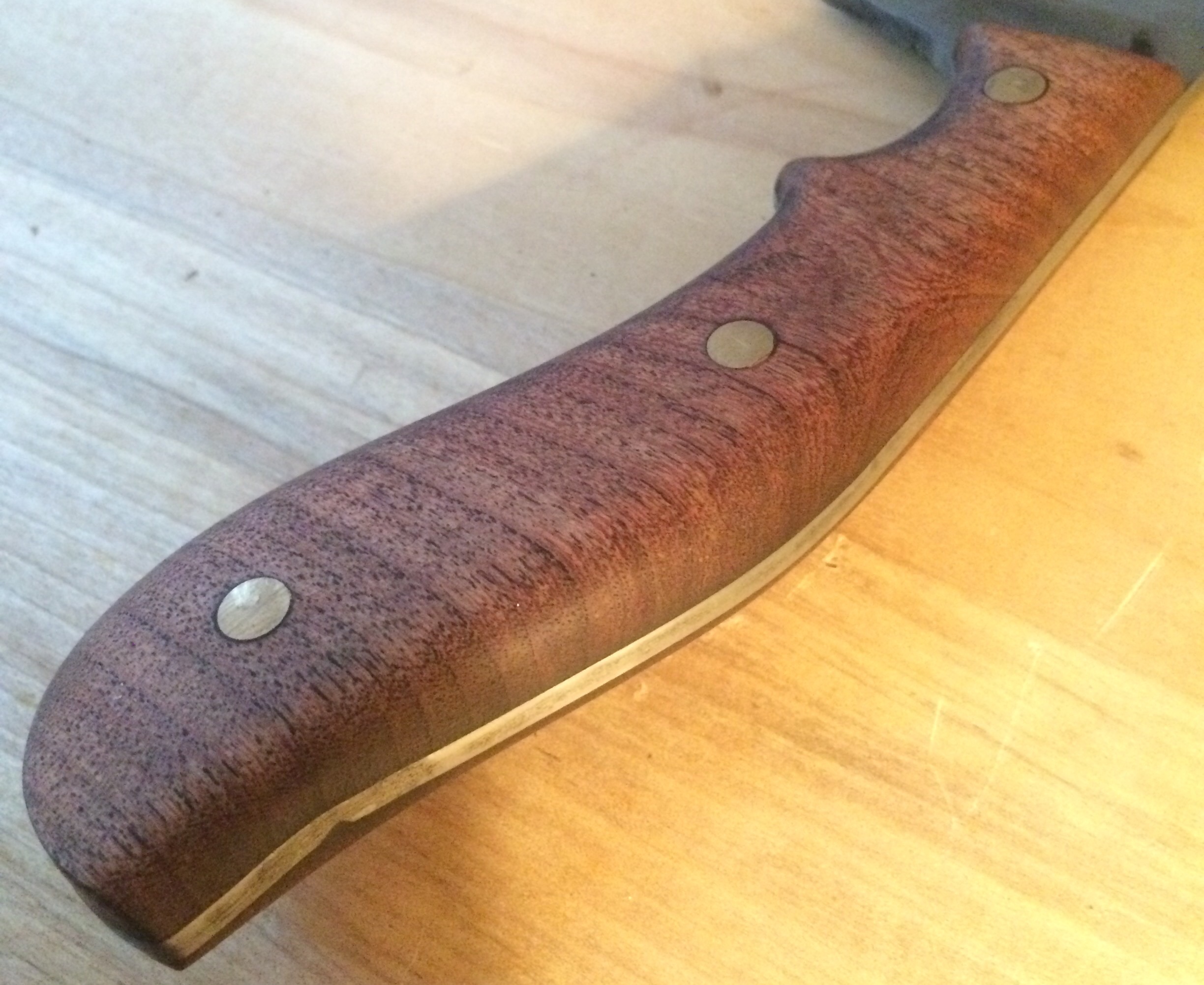I did a series of kitchen knife designs and this one was sort of a wild card.  Functionally she is a German style chef’s knife.  The clip in the blade gives her some forward momentum.  The drop in the handle rests comfortably in the heel of the hand, and also follows the natural line of the forearm through the wrist.  The finger choil provides a comfortable resting place for the lower three fingers if a traditional chef’s grip is preferred.