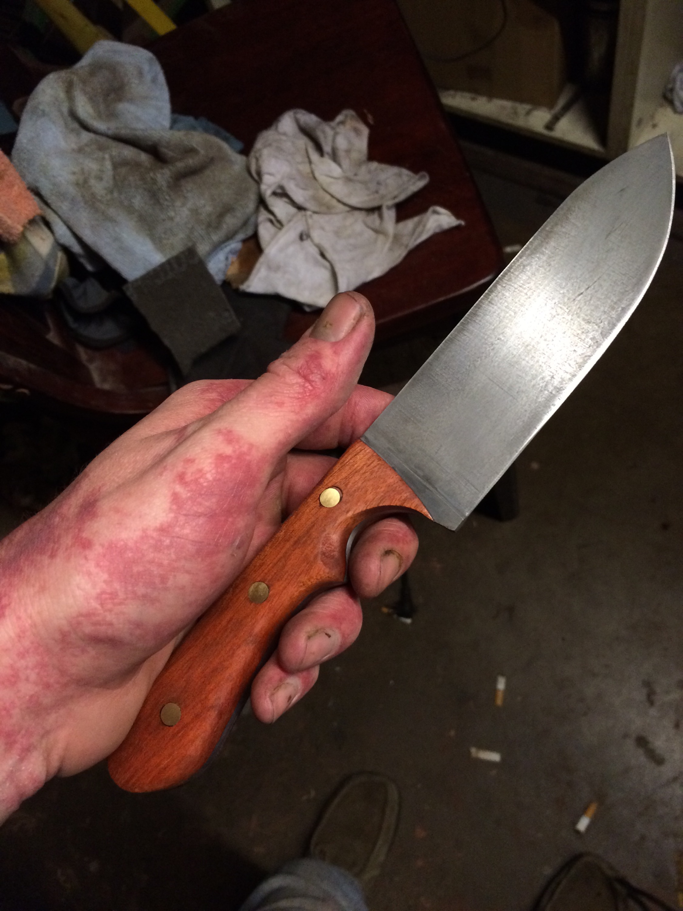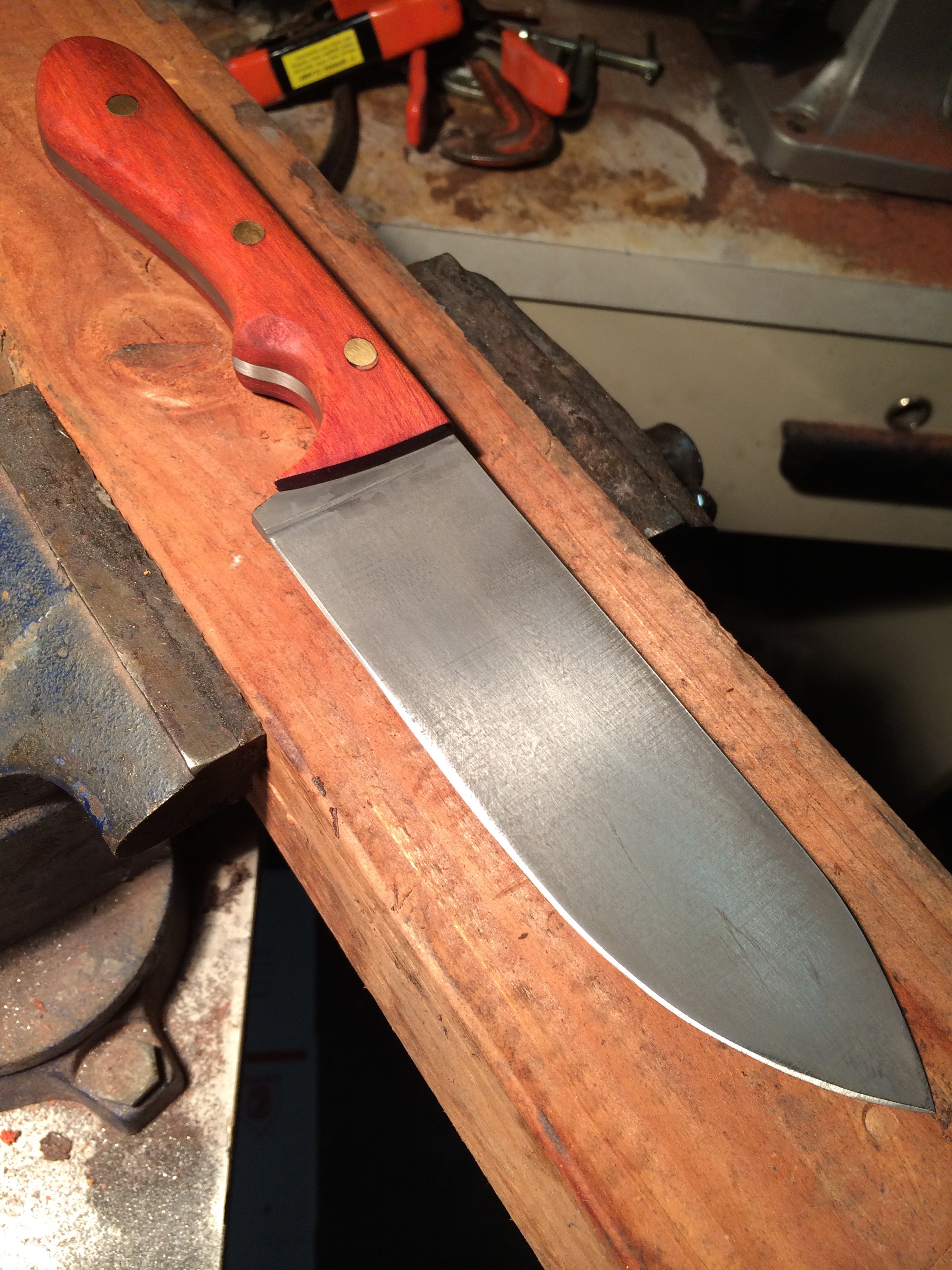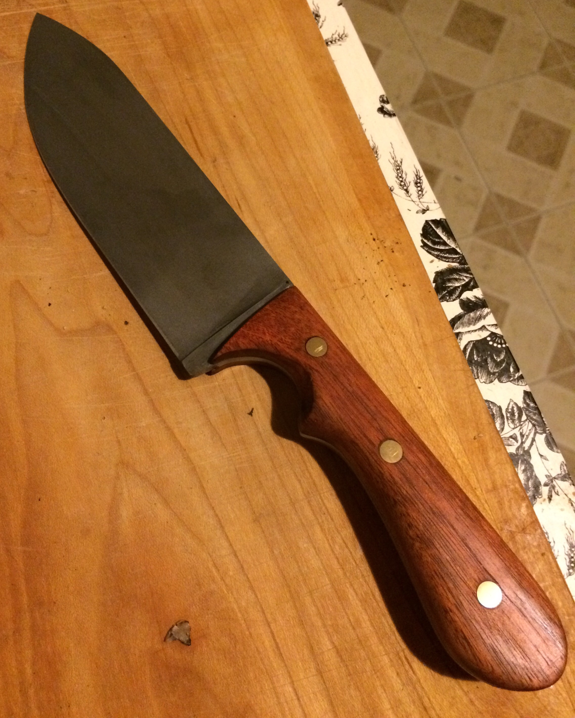 This knife was commissioned by his loving wife. This gentleman is a woodworker and musician, among other things, so I used some reclaimed Cherrywood that came off an old mantlepiece. The bolster is a micarta made from black jeans that I used to wear for a weekly big band gig. Something one of a kind for a unique man.