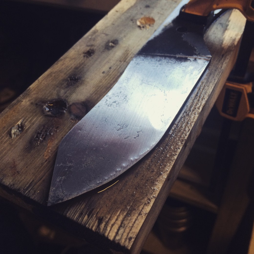 Initial work on the bevels. Removing too much steel will cause it to warp in the forge. Ready for heat treat: