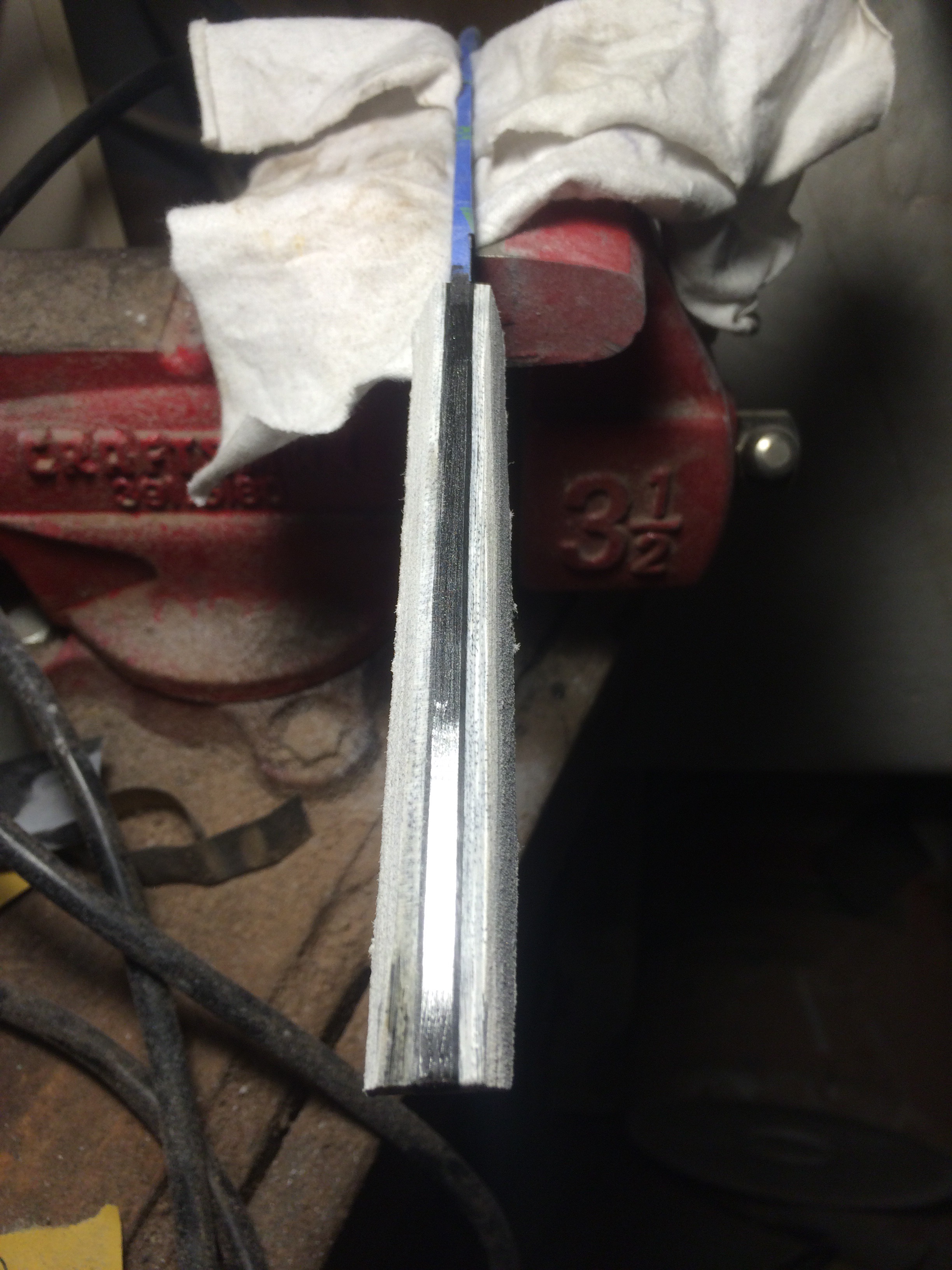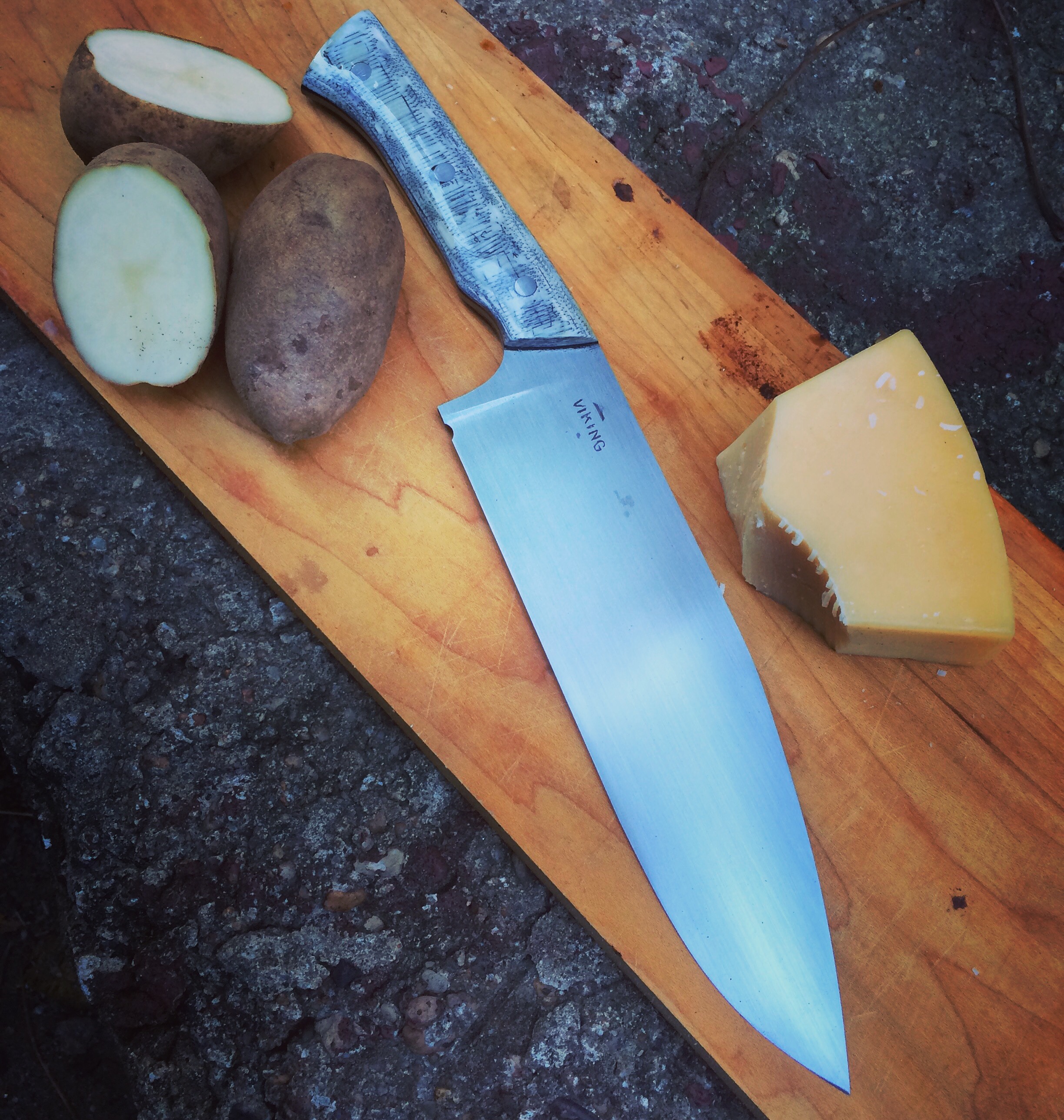 This knife was commissioned by his loving wife. This gentleman is a woodworker and musician, among other things, so I used some reclaimed Cherrywood that came off an old mantlepiece. The bolster is a micarta made from black jeans that I used to wear for a weekly big band gig. Something one of a kind for a unique man.