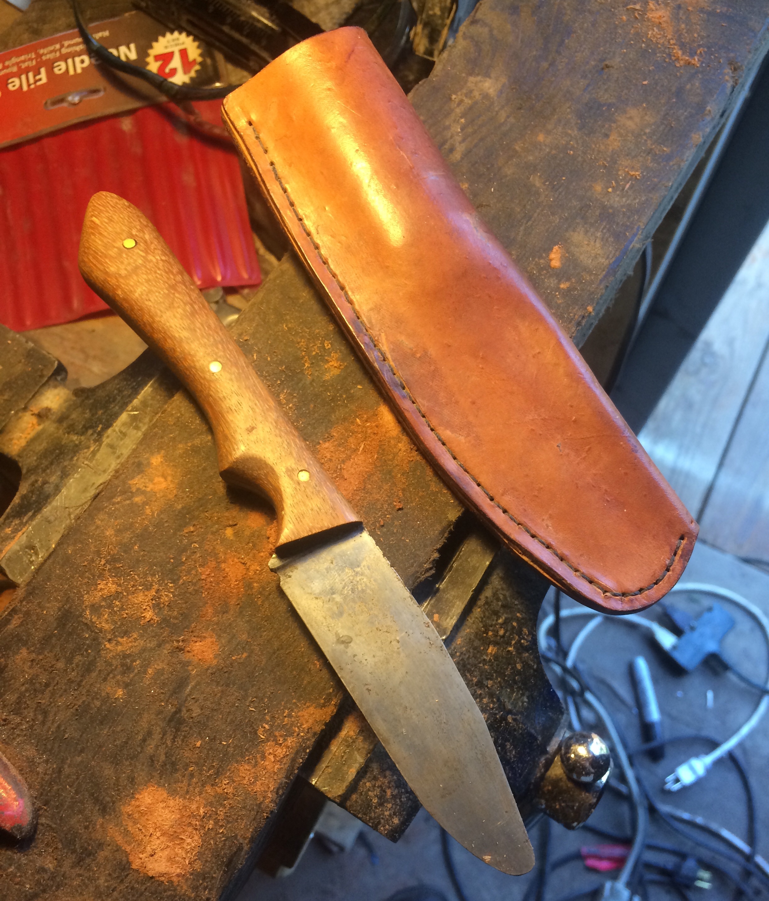 They still had Bob’s work clothes, and allowed me to make them into a handle material. Turning this man’s possessions into handmade kitchen tool to be used everyday seemed the best way to celebrate this man that everyone held dear. I started with a 8′ chef knife design: