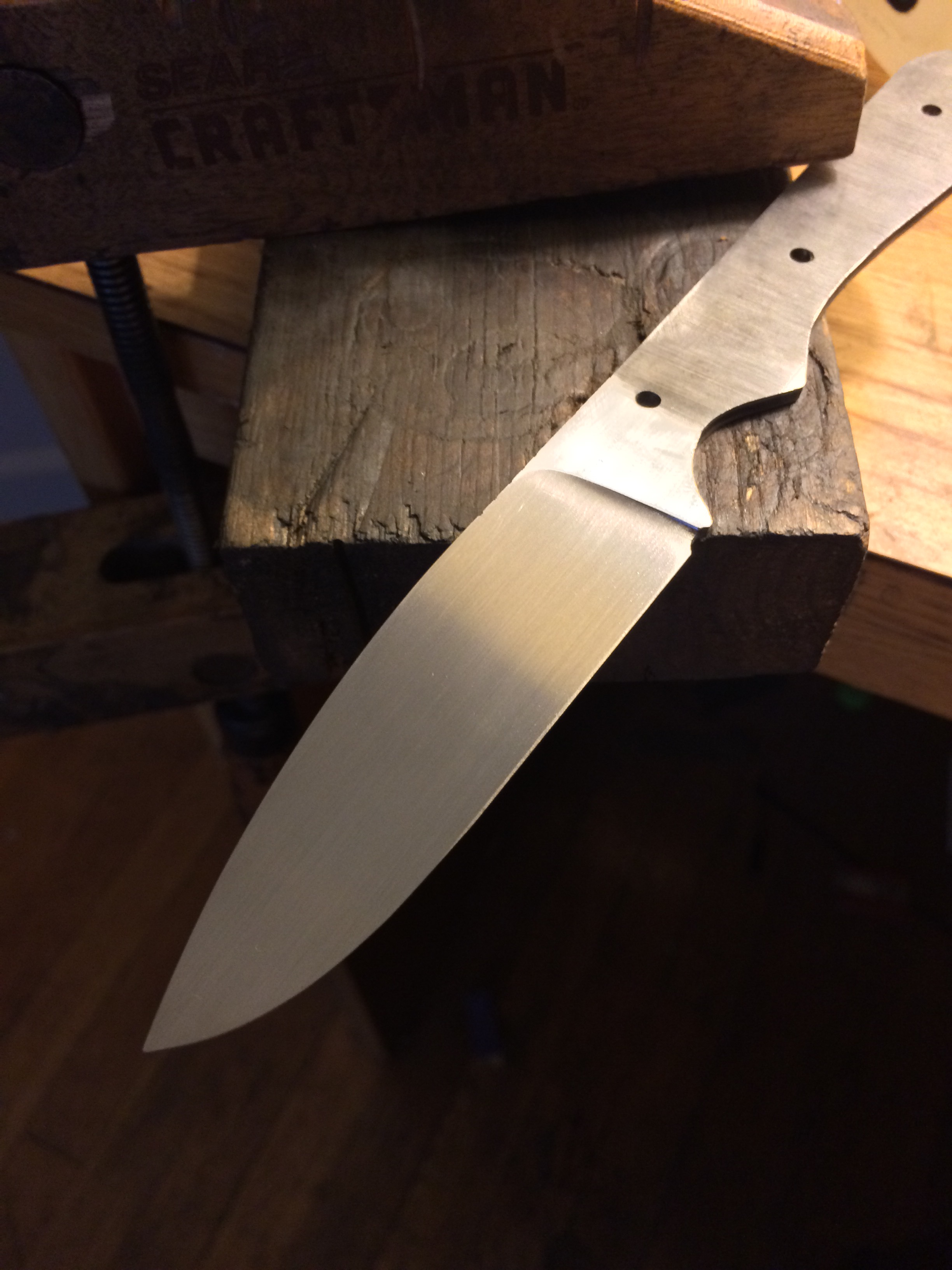 Centerline is scribed. The cutting edge is intentionally left thick and will be ground thin after heat treat.