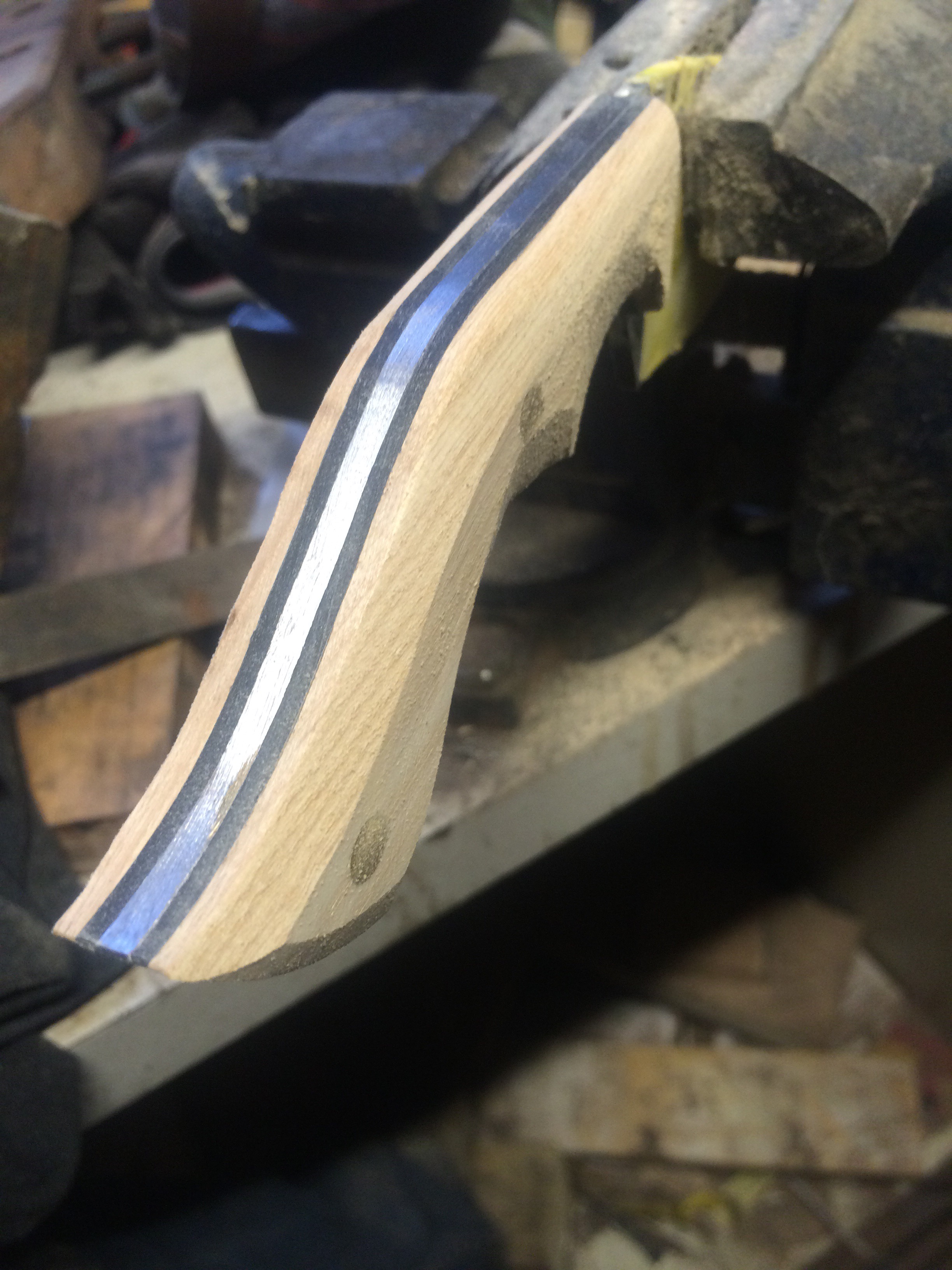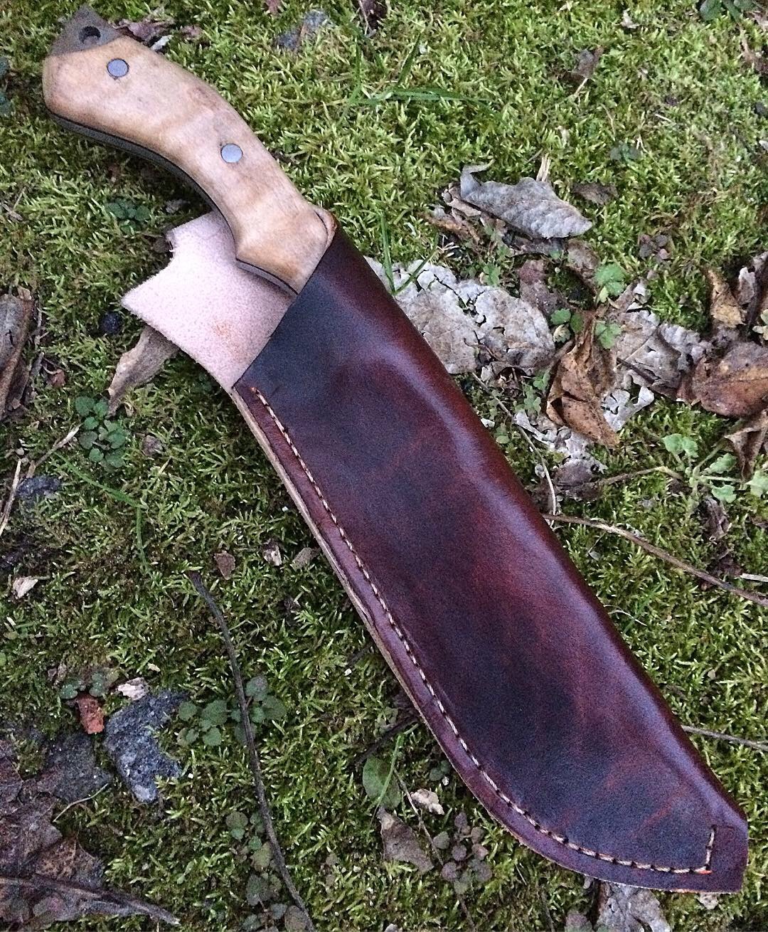 Getting back into the shop has been scary, and a slow process.  I was in the middle of this knife when I injured myself and I had to keep emailing the client to push back when I would have it finished.  I did all of the woodworking and leatherwork with eight fingers.  It’s been an exercise in leaning into fear and getting back on the horse.