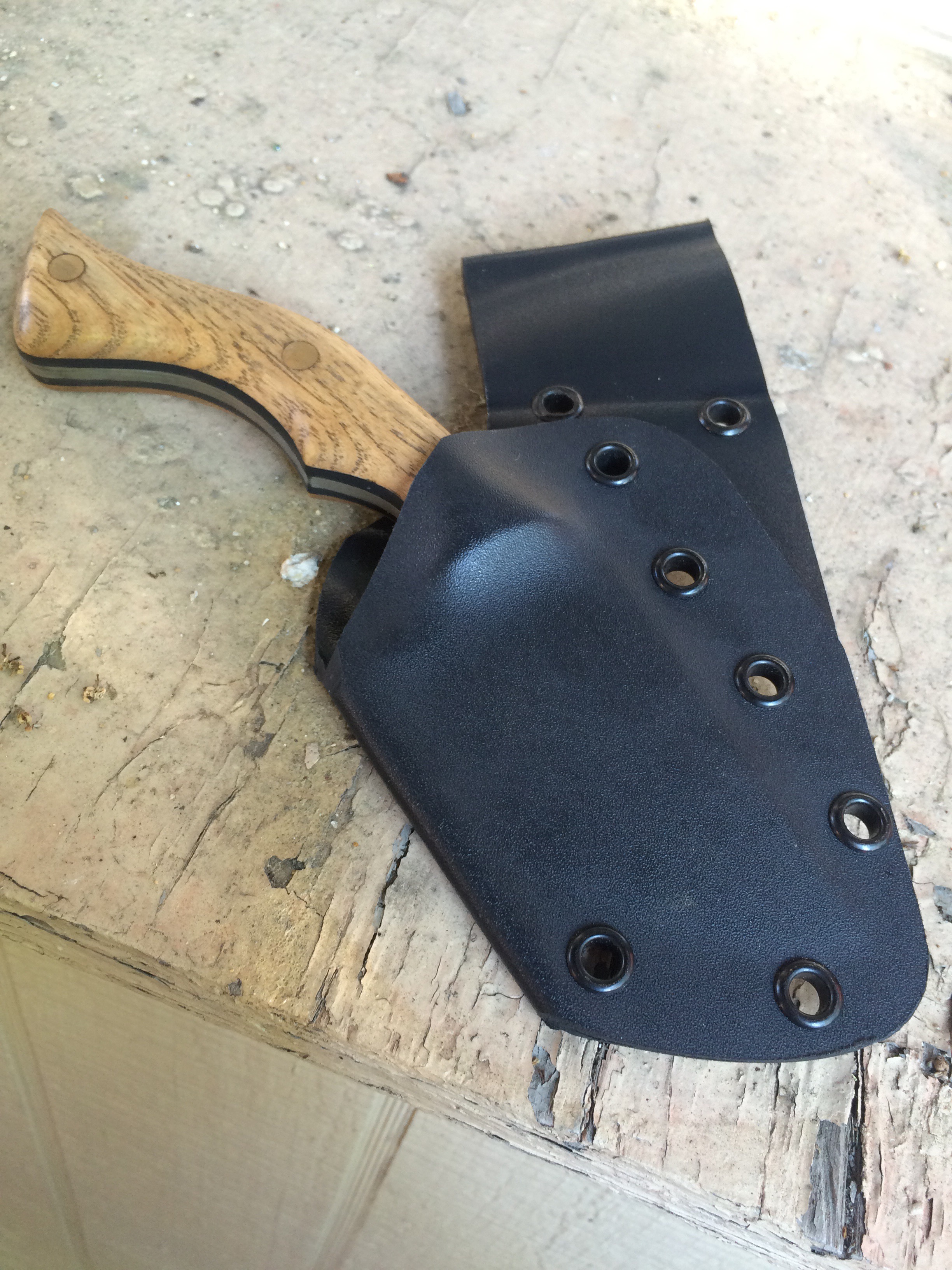 The Skin Yer Dinner:  Etched 1095 spring steel, Texas River ash handle, Kydex spacers, and brass hardware.  I also threw in a custom Kydex sheath…