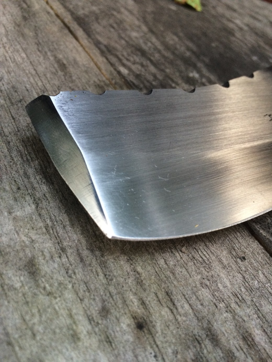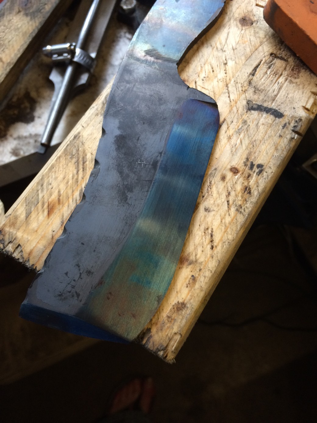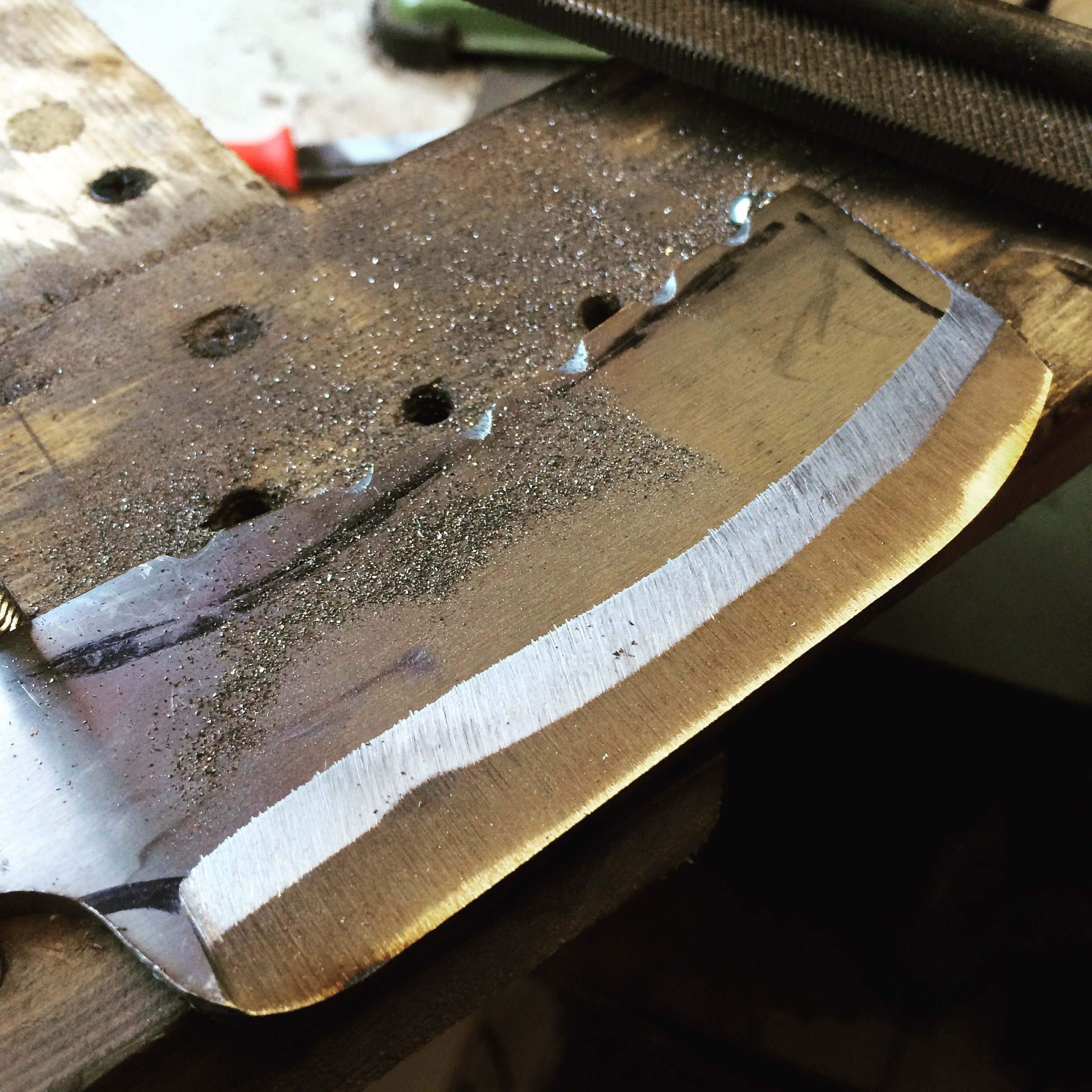 I made the original Persuader without thinking too much about it. The main grind is a sabre grind. I grind all of my blades freehand and as it turns out it is really difficult to get a uniform, symmetrical grind on a 2in wide piece of steel. But I didn’t know this the first time round- I just did it. When I tried to do it again I kept overthinking everything and ruining it. There were two or three between the first one and this one that got scrapped.